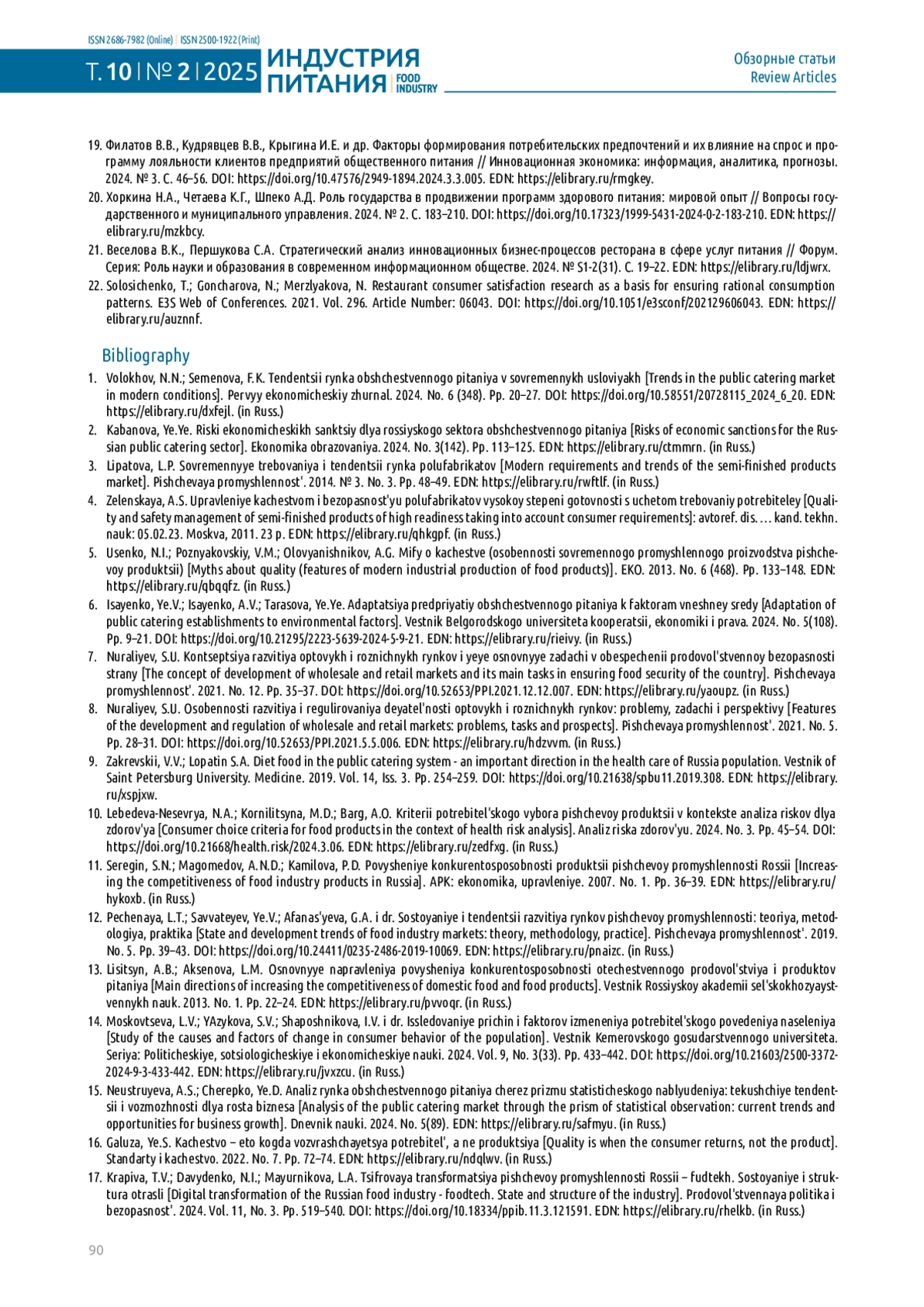 22. Solosichenko, T.; Goncharova, N.; Merzlyakova, N. Restaurant consumer satisfaction research as a basis for ensuring rational consumption patterns. E3S Web of Conferences. 2021. Vol. 296. Article Number: 06043. 10.1051/e3sconf/202129606043. DOI: 10.1051/e3sconf/202129606043.EDN EDN: AUZNNF