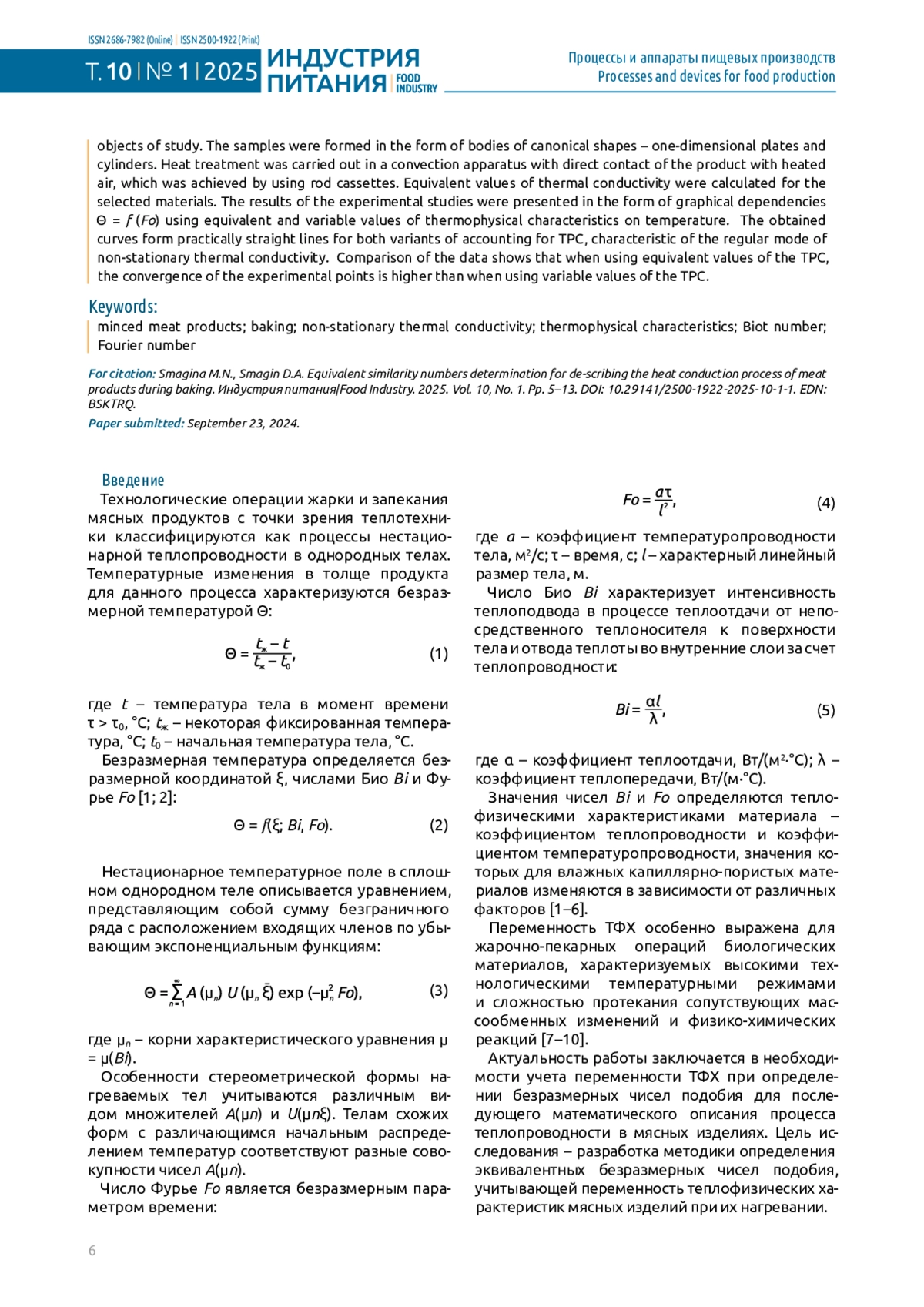 Процесс нагревания мясопродуктов при их запекании может быть описан на основе применения теории нестационарной теплопроводности. Однако при определении чисел подобия Фурье и Био возникает проблема учета переменности теплофизических характеристик (ТФХ) биологического материала. Изменение ТФХ мясопродуктов при нагревании протекает по сложным законам, что вызвано тепловыми эффектами фазовых и физико-химических изменений. На основе проведенных теоретических исследований предложена методика определения эквивалентных чисел Фурье и Био, учитывающая совокупное изменение ТФХ поверхностных и внутренних слоев мясных изделий при запекании. Для оценки эффективности предлагаемой методики проведены экспериментальные исследования. В качестве объектов исследования выбраны образцы измельченного мяса, различающиеся по соотношению «жиросодержание – влагосодержание» (влажный обезжиренный и маловлажный жирный). Образцы формировались в виде тел канонических форм – одномерных пластины и цилиндра. Термообработка проводилась в конвекционном аппарате при прямом контакте продукта с нагретым воздухом, что достигалось за счет использования стержневых кассет. Для выбранных материалов рассчитывали эквивалентные значения ТФХ. Результаты экспериментальных исследований представляли в виде графических зависимостей Θ = f (Fo) с использованием эквивалентных и переменных значений ТФХ от температуры. Полученные кривые образуют практически прямые линии для обоих вариантов учета ТФХ, характерные для регулярного режима нестационарной теплопроводности. Сравнение данных показывает, что при использовании эквивалентных значений ТФХ сходимость экспериментальных точек более высокая, чем при использовании переменных значений ТФХ