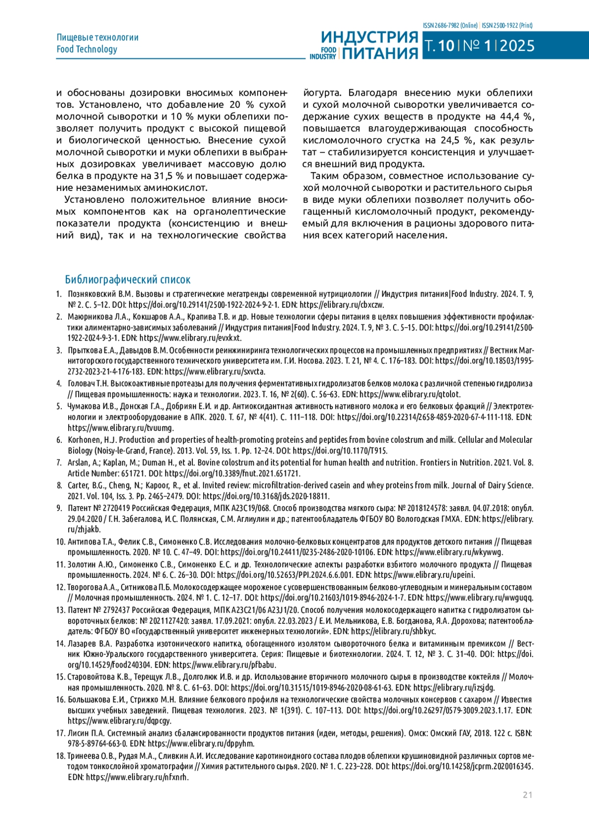 2. Маюрникова Л.А., Кокшаров А.А., Крапива Т.В. и др. Новые технологии сферы питания в целях повышения эффективности профилактики алиментарно-зависимых заболеваний // Индустрия питания|Food Industry. 2024. Т. 9, № 3. С. 5-15. 10.29141/2500-1922-2024-9-3-1. DOI: 10.29141/2500-1922-2024-9-3-1.EDN EDN: EVXKXT