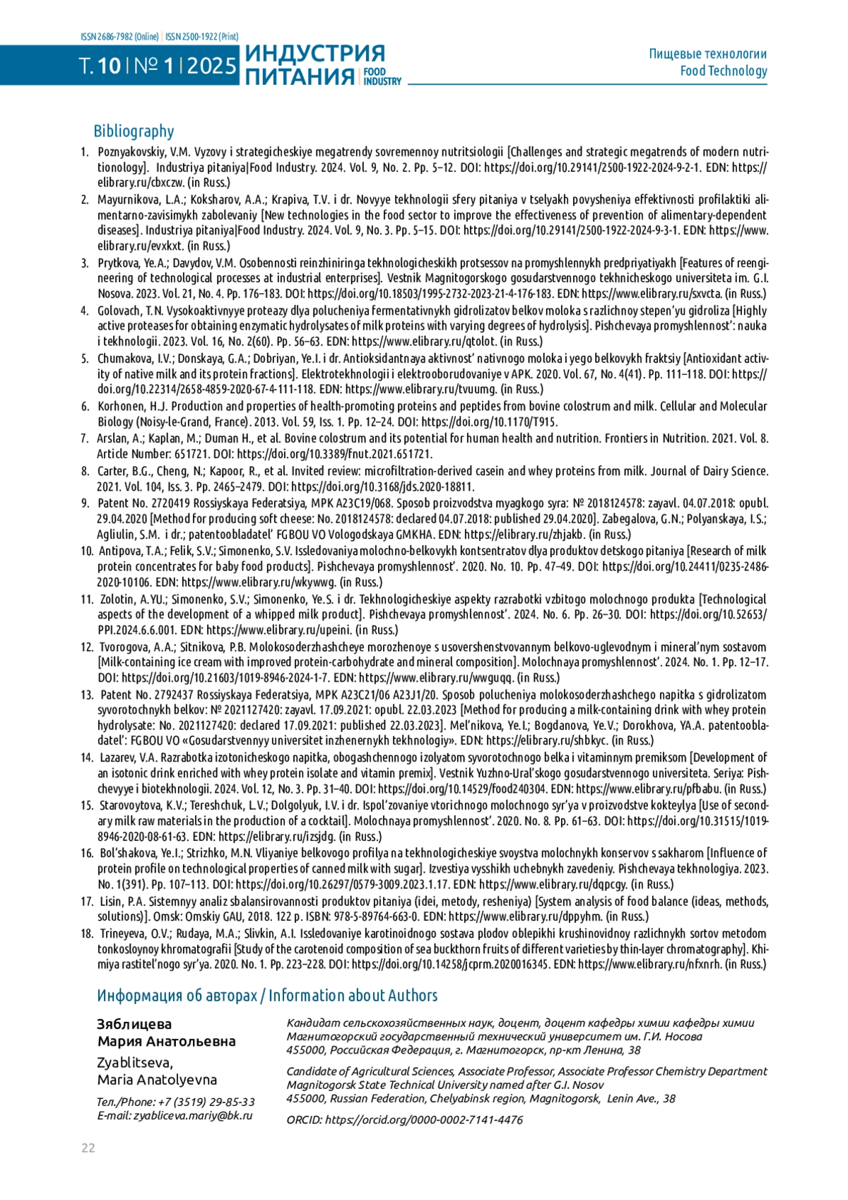4. Головач Т.Н. Высокоактивные протеазы для получения ферментативных гидролизатов белков молока с различной степенью гидролиза // Пищевая промышленность: наука и технологии. 2023. Т. 16, № 2(60). С. 56-63. EDN: QTOLOT