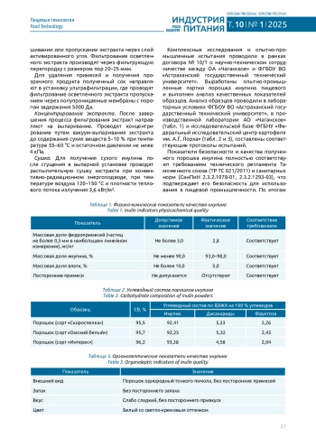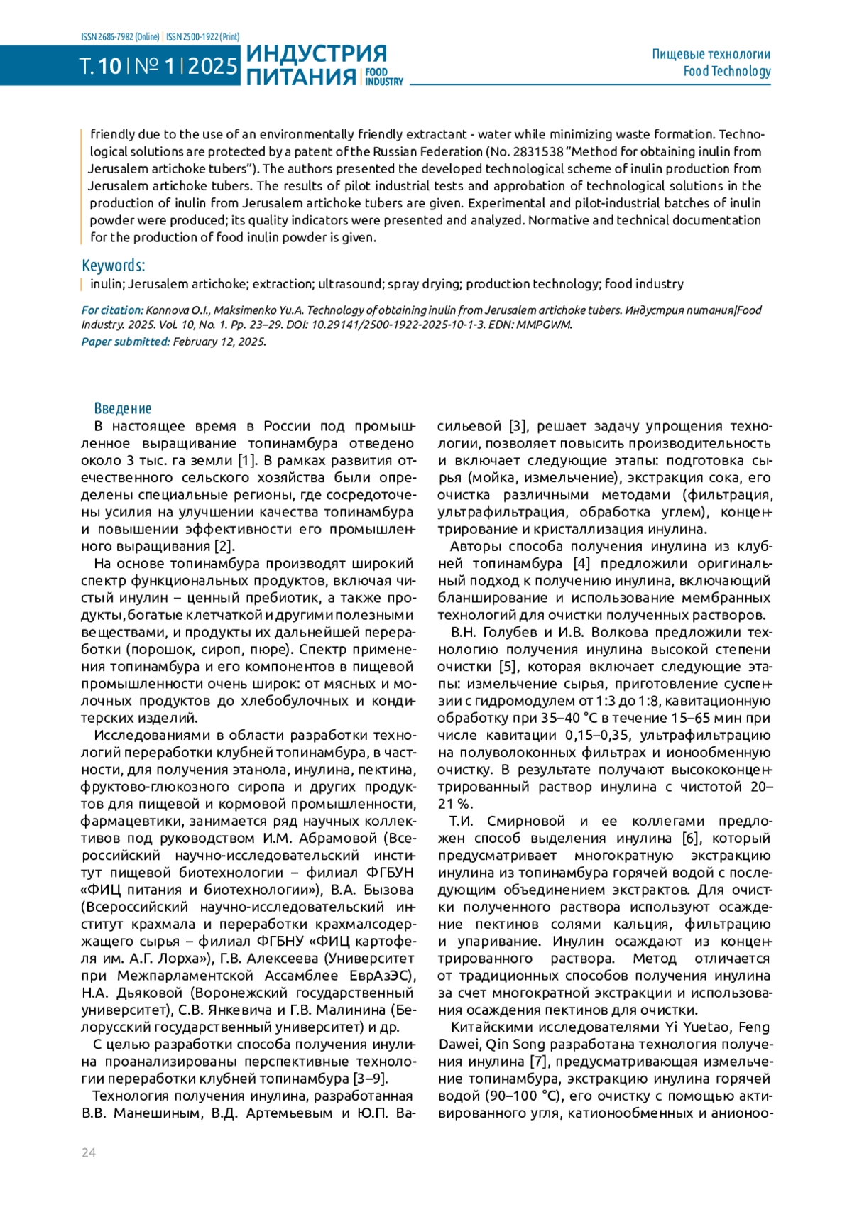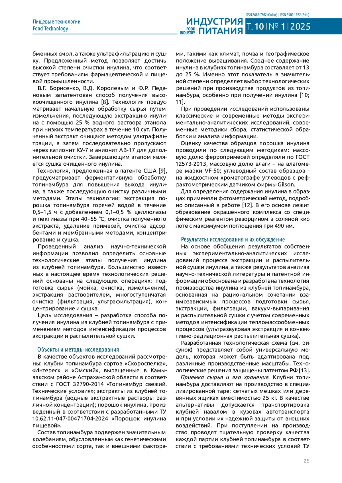 В соответствии с целью исследований разработан способ производства инулина из клубней топинамбура, основанный на рациональном сочетании взаимозависимых технологических процессов подготовки сырья, экстракции, фильтрации, вакуум-выпаривания и распылительной конвективно-радиационной сушки с учетом современных методов интенсификации тепломассообменных процессов. Оптимизирован процесс экстракции инулина с использованием ультразвука, последующей очисткой и концентрированием экстракта. Применение распылительной сушки с комбинированным энергоподводом позволило получить качественный продукт. При разработке способа были обобщены результаты анализа научной, научно-технической литературы и патентной информации и результаты экспериментальных исследований. Предлагаемая технология получения инулина из клубней топинамбура отличается от традиционных методов более высокой эффективностью извлечения целевого продукта за счет оптимального сочетания ультразвуковой обработки, вакуумной фильтрации и распылительной сушки с комбинированным энергоподводом. Использование инновационных подходов позволило существенно сократить время процесса экстрагирования и повысить выход инулина. Разработанная технология получения инулина из клубней топинамбура отличается высокой экологичностью благодаря использованию безопасного для окружающей среды экстрагента – воды при минимизации образования отходов. Технологические решения защищены патентом РФ (No 2831538 «Способ получения инулина из клубней топинамбура»). Представлена разработанная технологическая схема производства инулина из клубней топинамбура. Приведены результаты опытно-промышленных испытаний и апробации технологических решений при производстве инулина из клубней топинамбура. Были произведены опытные, опытно-промышленные партии порошка инулина, представлены и проанализированы его качественные показатели. Приведена нормативно-техническая документация для производства порошка инулина пищевого.