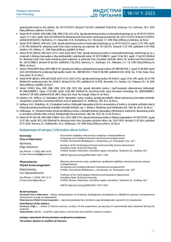 13. Патент РФ № 2831538, МПК C08B 37/0054; A23L 19/10; C08B 37/18. Способ получения инулина из клубней топинамбура: № 2024119592: заявл. 12.07.2024: опубл. 09.12.2024 / О.И. Коннова, Ю.А. Максименко, И.Ю. Алексанян. EDN: EICRRO