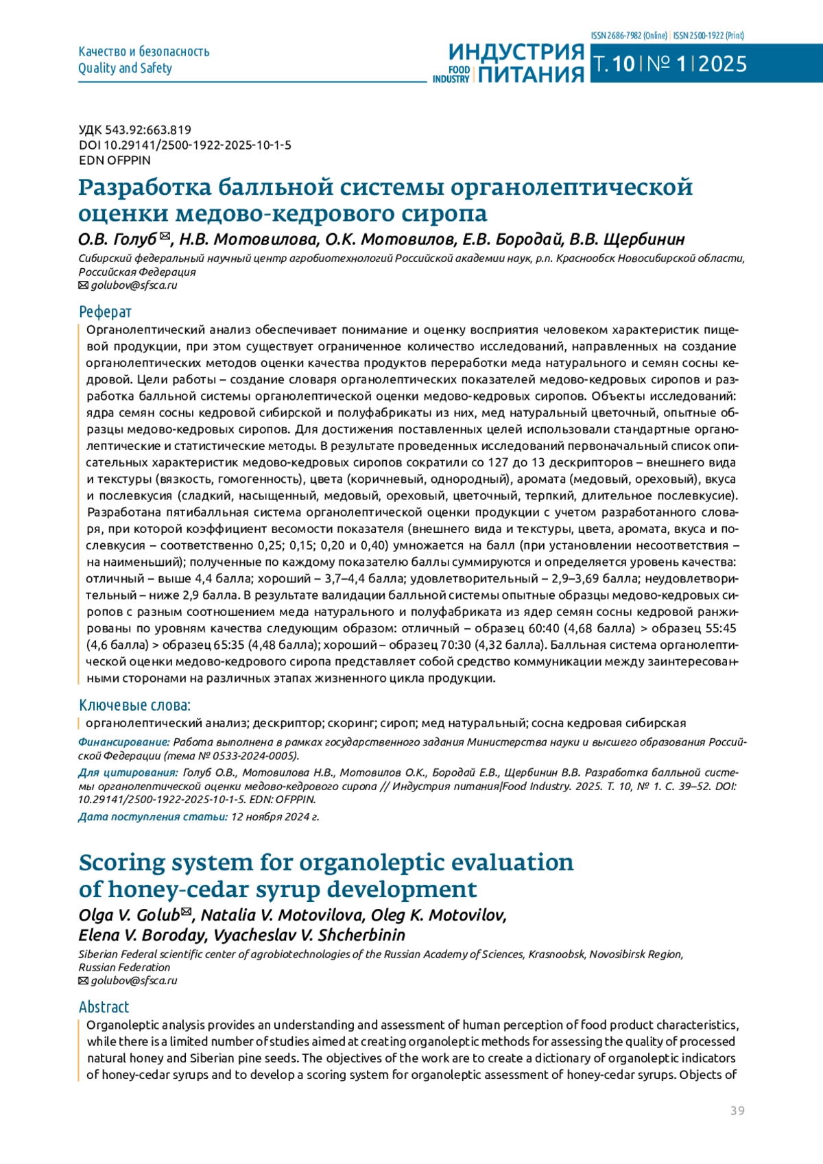 Органолептический анализ обеспечивает понимание и оценку восприятия человеком характеристик пищевой продукции, при этом существует ограниченное количество исследований, направленных на создание органолептических методов оценки качества продуктов переработки меда натурального и семян сосны кедровой. Цели работы – создание словаря органолептических показателей медово-кедровых сиропов и разработка балльной системы органолептической оценки медово-кедровых сиропов. Объекты исследований: ядра семян сосны кедровой сибирской и полуфабрикаты из них, мед натуральный цветочный, опытные образцы медово-кедровых сиропов. Для достижения поставленных целей использовали стандартные органолептические и статистические методы. В результате проведенных исследований первоначальный список описательных характеристик медово-кедровых сиропов сократили со 127 до 13 дескрипторов – внешнего вида и текстуры (вязкость, гомогенность), цвета (коричневый, однородный), аромата (медовый, ореховый), вкуса и послевкусия (сладкий, насыщенный, медовый, ореховый, цветочный, терпкий, длительное послевкусие). Разработана пятибалльная система органолептической оценки продукции с учетом разработанного словаря, при которой коэффициент весомости показателя (внешнего вида и текстуры, цвета, аромата, вкуса и послевкусия – соответственно 0,25; 0,15; 0,20 и 0,40) умножается на балл (при установлении несоответствия – на наименьший); полученные по каждому показателю баллы суммируются и определяется уровень качества: отличный – выше 4,4 балла; хороший – 3,7–4,4 балла; удовлетворительный – 2,9–3,69 балла; неудовлетворительный – ниже 2,9 балла. В результате валидации балльной системы опытные образцы медово-кедровых сиропов с разным соотношением меда натурального и полуфабриката из ядер семян сосны кедровой ранжированы по уровням качества следующим образом: отличный – образец 60:40 (4,68 балла) > образец 55:45 (4,6 балла) > образец 65:35 (4,48 балла); хороший – образец 70:30 (4,32 балла). Балльная система органолептической оценки медово-кедрового сиропа представляет собой средство коммуникации между заинтересованными сторонами на различных этапах жизненного цикла продукции.