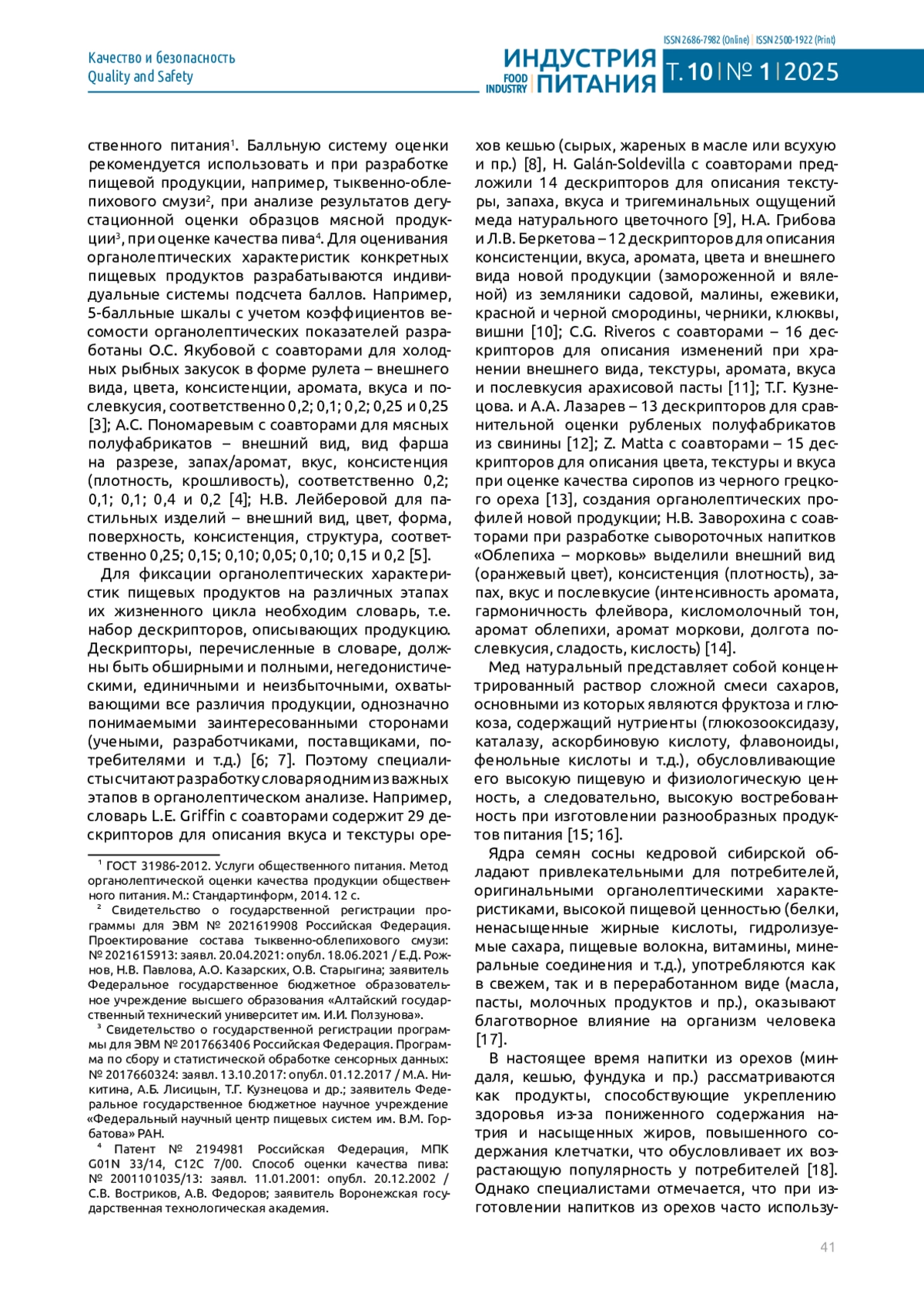 1. Комин А.Э., Ким И.Н., Бородин И.И. Современное состояние и перспективы развития сенсорного анализа пищевых продуктов // Технологии пищевой и перерабатывающей промышленности АПК - продукты здорового питания. 2020. № 4. С. 43-50. EDN: NOEYNF