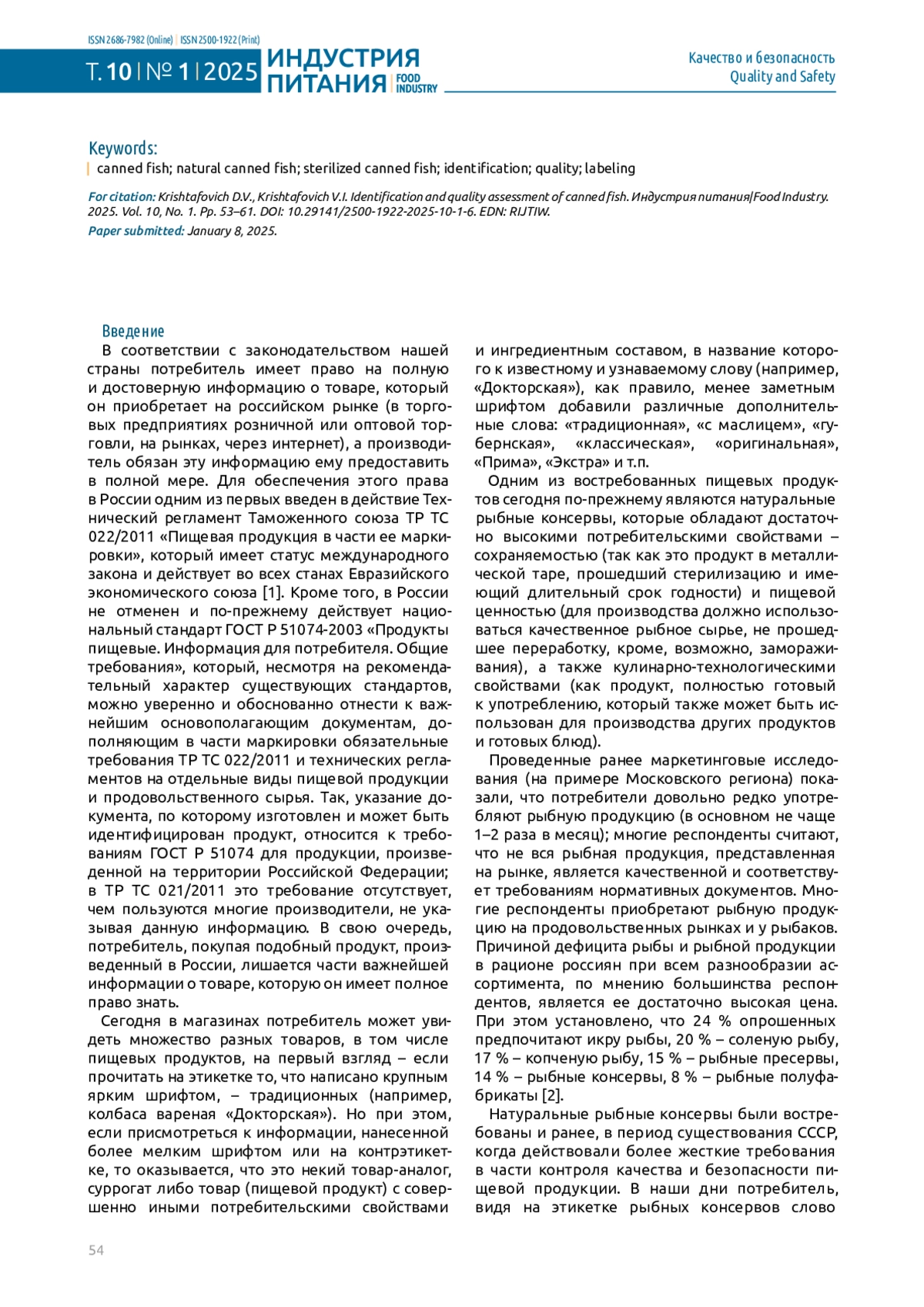 10. Криштафович В.И., Муртазина К.Р. Особенности современной классификации рыбных консервов // Товаровед продовольственных товаров. 2022. № 4. С. 230-238. 10.33920/igt-01-2204-01. DOI: 10.33920/igt-01-2204-01.EDN EDN: XEGWTY