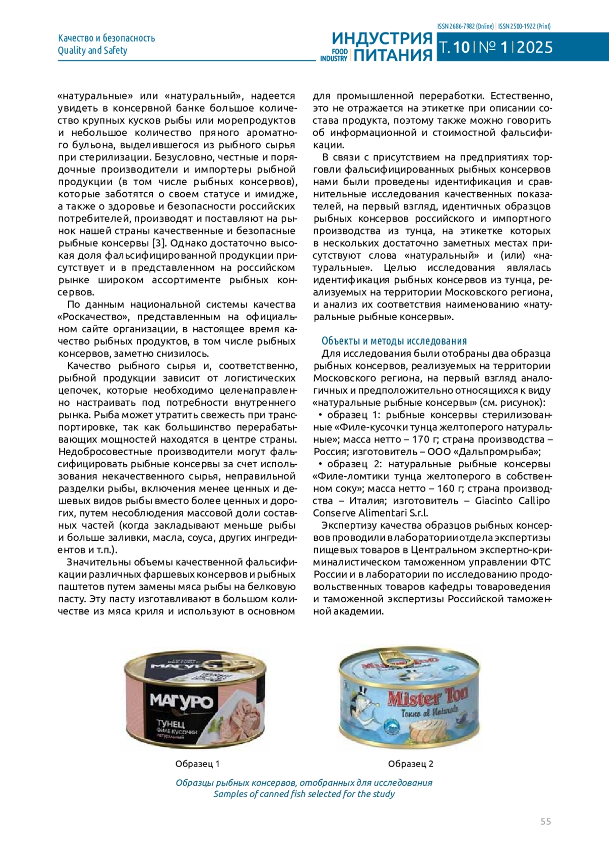 В статье представлены результаты идентификации идентичных образцов рыбных консервов российского и импортного производства из тунца, на этикетке которых присутствует слово «натуральный». Целью исследования являлась идентификация рыбных консервов из тунца, реализуемых на территории Московского региона, и анализ их соответствия наименованию «натуральные рыбные консервы». Установлено, что отечественный образец не соответствует данному наименованию. Фактическое содержание рыбы позволяет отнести продукт к рыбным консервам; слово «натуральный» (в единственном и множественном числе) относится не к виду консервов, а к тунцу; имеются отклонения фактических результатов от информации, указанной на маркировке. Определено, что масса нетто несколько превышает заявленную на маркировке: у отечественного образца – на 1,1 %, у образца импортного производства – на 1,9 %. Установлено, что массовые доли белка и жира образцов исследования в несколько раз превышают значения, заявленные на маркировке. Фактическая массовая доля пищевой соли в образце импортного производства в 2,5 раза превышает значение, указанное на этикетке. Таким образом, образец импортного производства условно может быть отнесен к натуральным рыбным консервам, однако при оценке его качества были выявлены значительные несоответствия. Установлено, что в техническом регламенте на рыбную продукцию нарушена иерархия и системность определения терминов, что может негативно сказаться на процессе идентификации данного вида рыбной продукции. Для обеспечения российских потребителей качественными натуральными консервами из рыбы и исключения фальсификации назрела объективная необходимость в ужесточении контроля за информацией, размещаемой на этикетке продукции.
