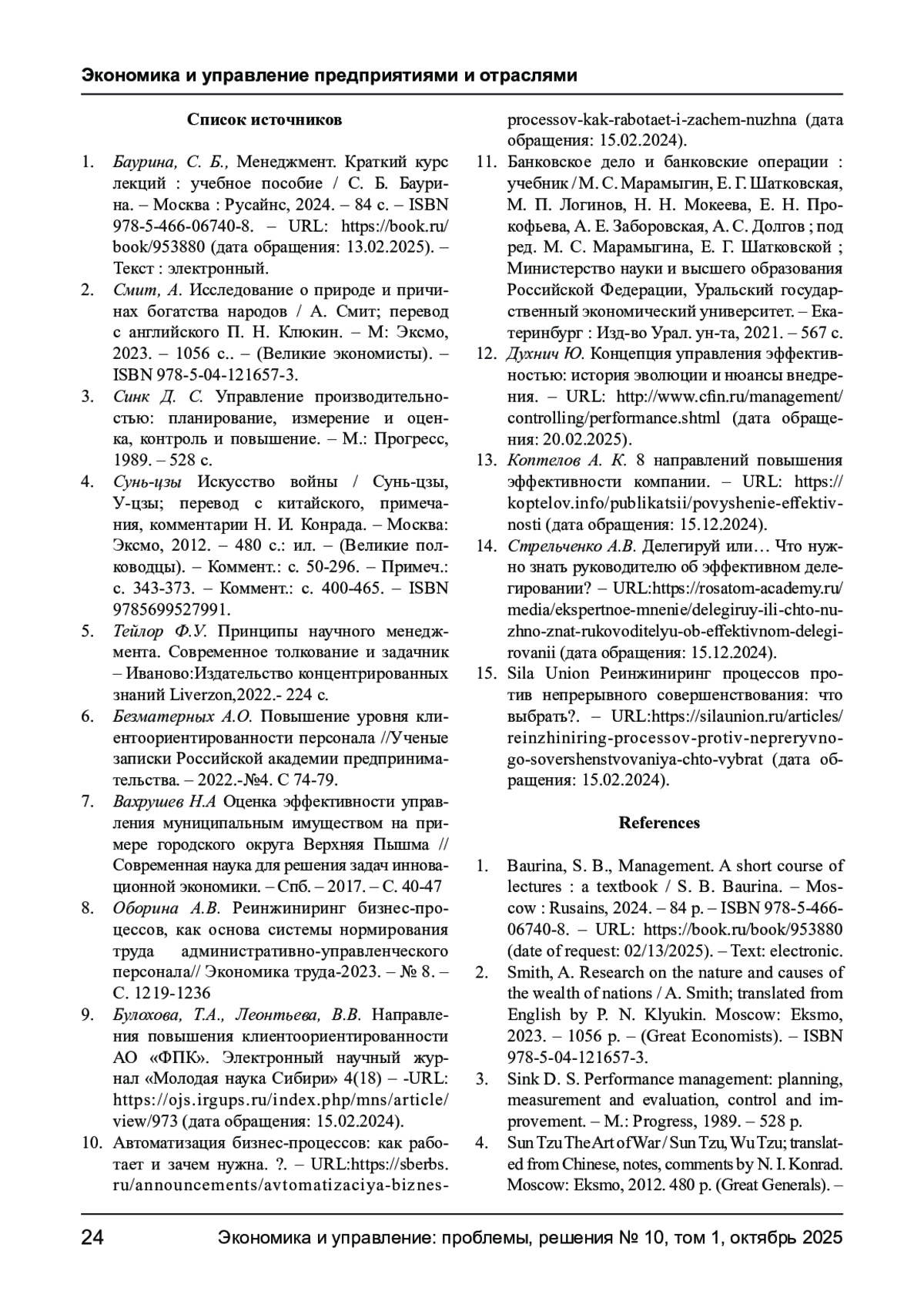 1. Баурина, С. Б., Менеджмент. Краткий курс лекций: учебное пособие / С. Б. Баурина. - Москва: Русайнс, 2024. - 84 с. - URL: https://book.ru/book/953880 (дата обращения: 13.02.2025). - Текст: электронный. ISBN: 978-5-466-06740-8 EDN: QFLLPI