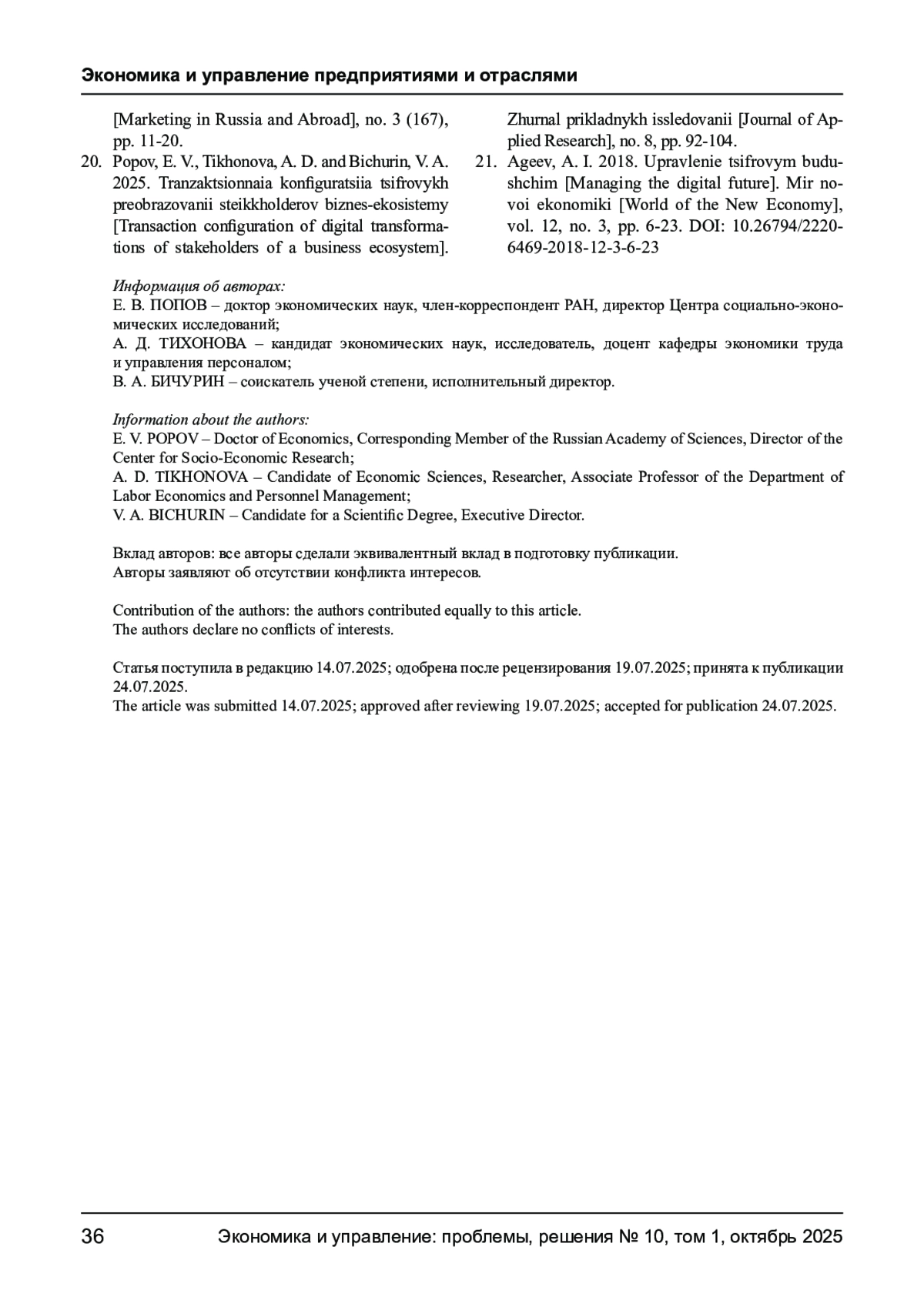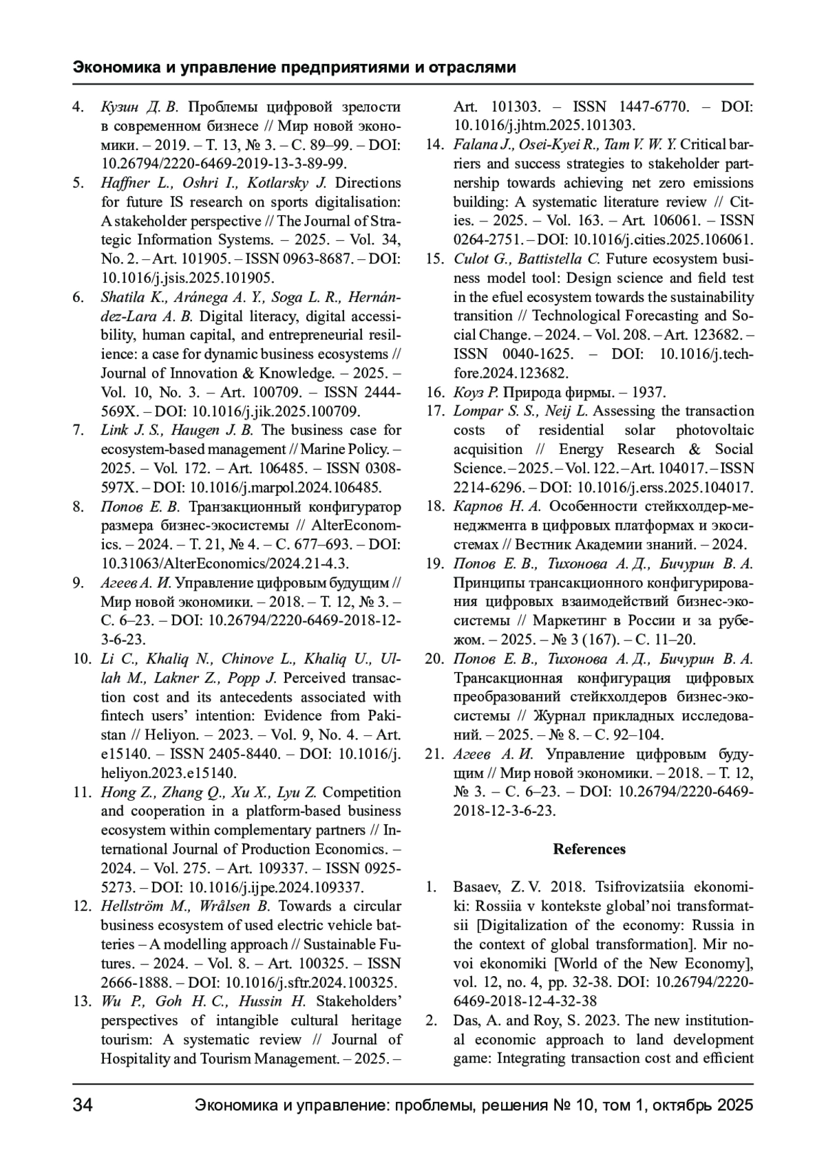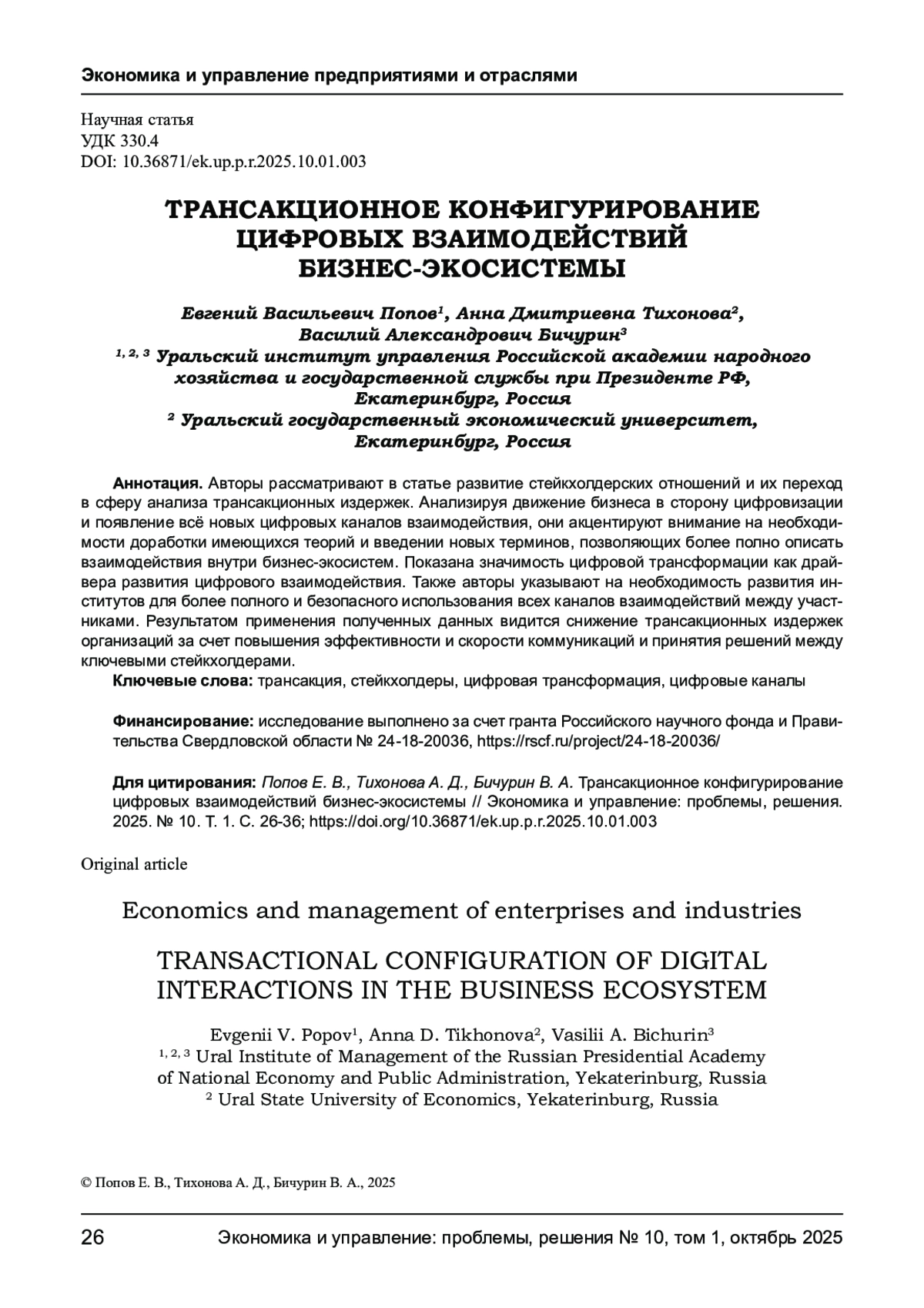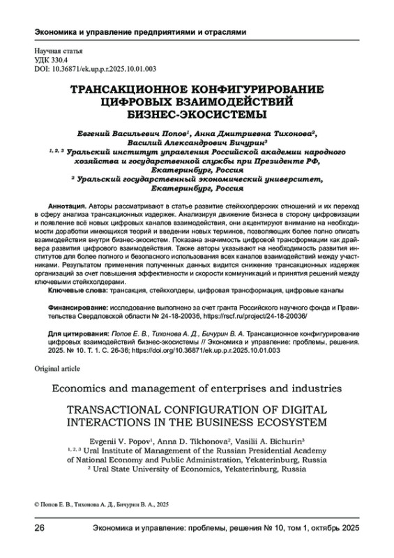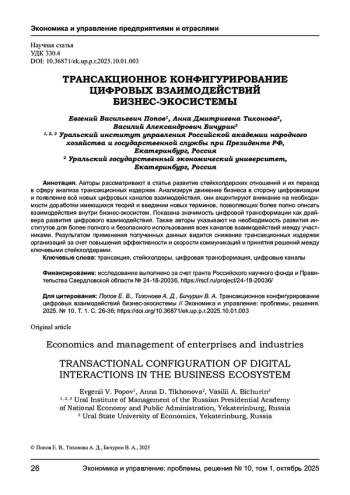 ПОПОВ Е. В., ТИХОНОВА А. Д., БИЧУРИН В. А. ТРАНСАКЦИОННОЕ КОНФИГУРИРОВАНИЕ ЦИФРОВЫХ ВЗАИМОДЕЙСТВИЙ БИЗНЕС-ЭКОСИСТЕМЫ // ЭКОНОМИКА И УПРАВЛЕНИЕ: ПРОБЛЕМЫ, РЕШЕНИЯ. 2025. ТОМ 1 № 10