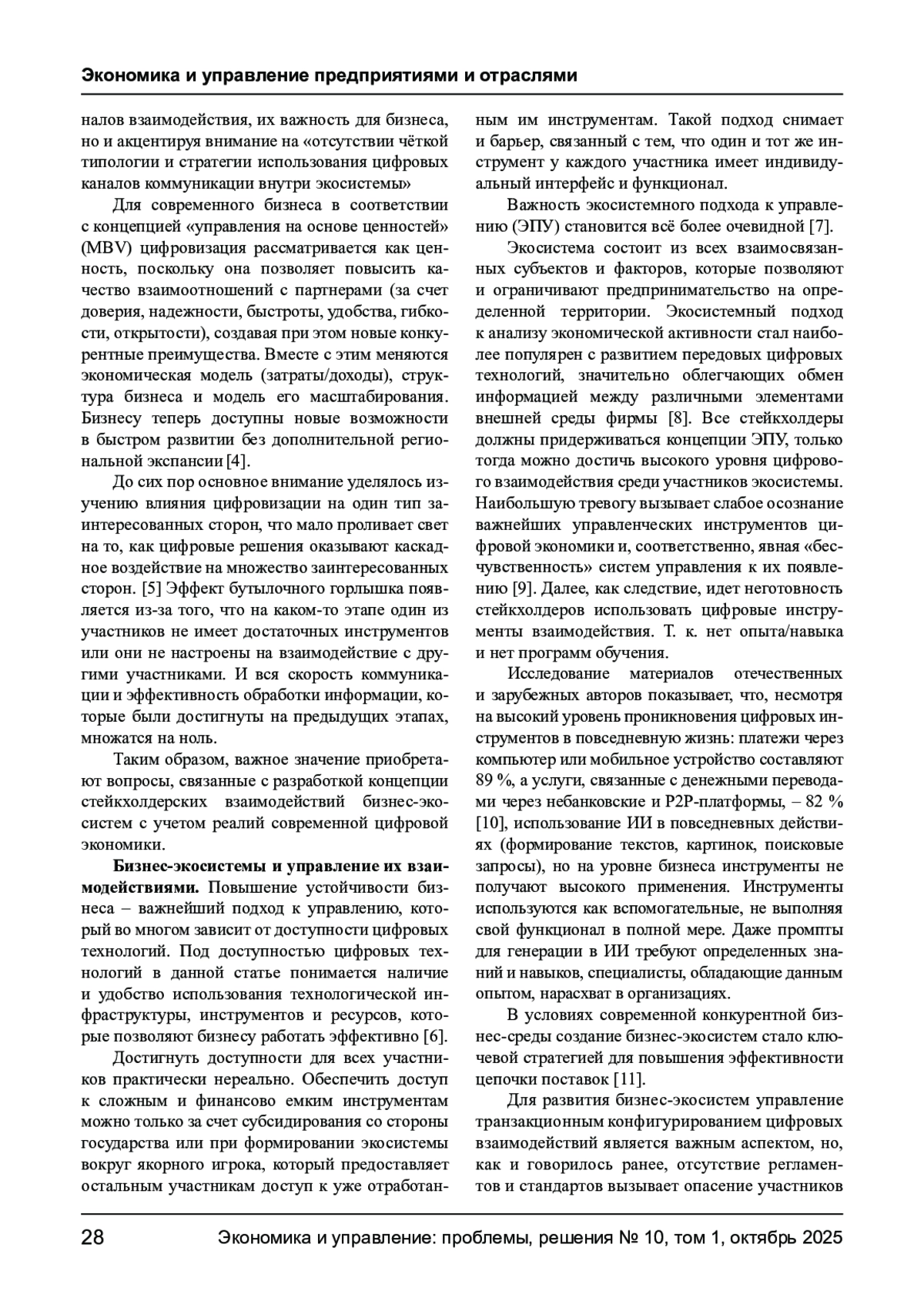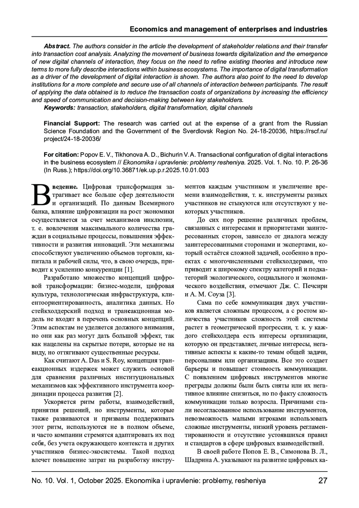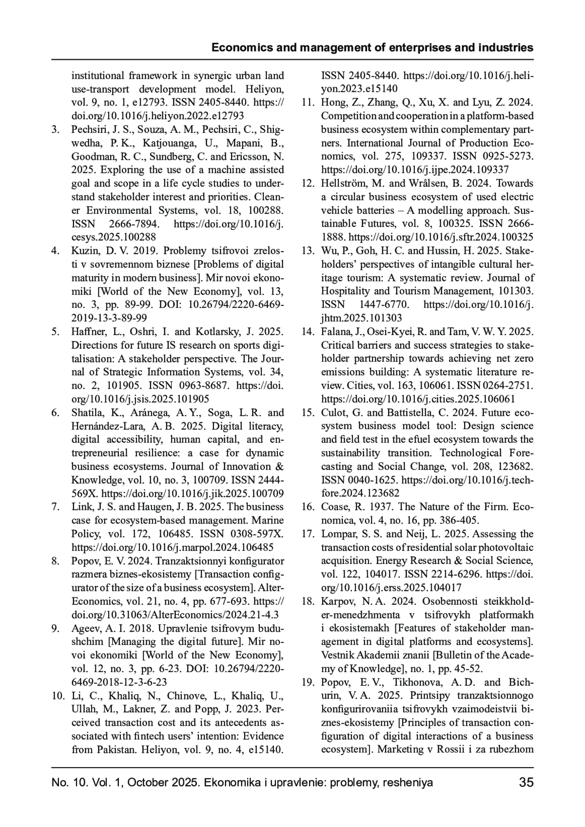ПОПОВ Е. В., ТИХОНОВА А. Д., БИЧУРИН В. А. ТРАНСАКЦИОННОЕ КОНФИГУРИРОВАНИЕ ЦИФРОВЫХ ВЗАИМОДЕЙСТВИЙ БИЗНЕС-ЭКОСИСТЕМЫ // ЭКОНОМИКА И УПРАВЛЕНИЕ: ПРОБЛЕМЫ, РЕШЕНИЯ. 2025. ТОМ 1 № 10