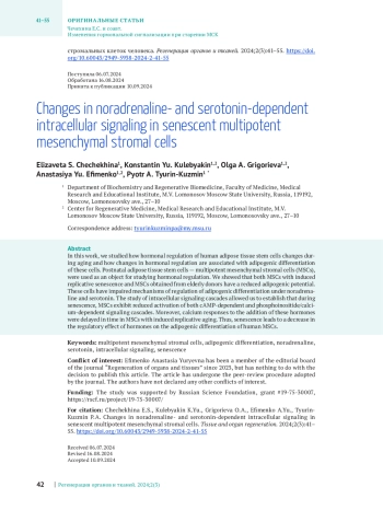 В данной работе мы исследовали изменения гормональной регуляции стволовых клеток жировой ткани человека при старении и то, как эти изменения ассоциированы с адипогенной дифференцировкой этих клеток. В качестве объекта изучения гормональной регуляции использовали постнатальные стволовые клетки жировой ткани — мультипотентные мезенхимные стромальные клетки (МСК). Мы показали, что как МСК с индуцированным репликативным старением, так и МСК, полученные от пожилых доноров, обладают сниженным адипогенным потенциалом, также у этих клеток нарушены механизмы регуляции адипогенной дифференцировки при действии норадреналина и серотонина. Изучение внутриклеточных сигнальных каскадов позволило установить, что при старении в МСК проявляется пониженная активация как цАМФ-зависимых, так и фосфоинозитид/ кальций-зависимых сигнальных каскадов. Кальциевые ответы на стимуляцию норадреналином и серотонином оказались отложенными во времени в МСК с индуцированным репликативным старением. Таким образом, старение приводит к снижению регуляторного воздействия гормонов-регуляторов на адипогенную дифференцировку МСК человека.