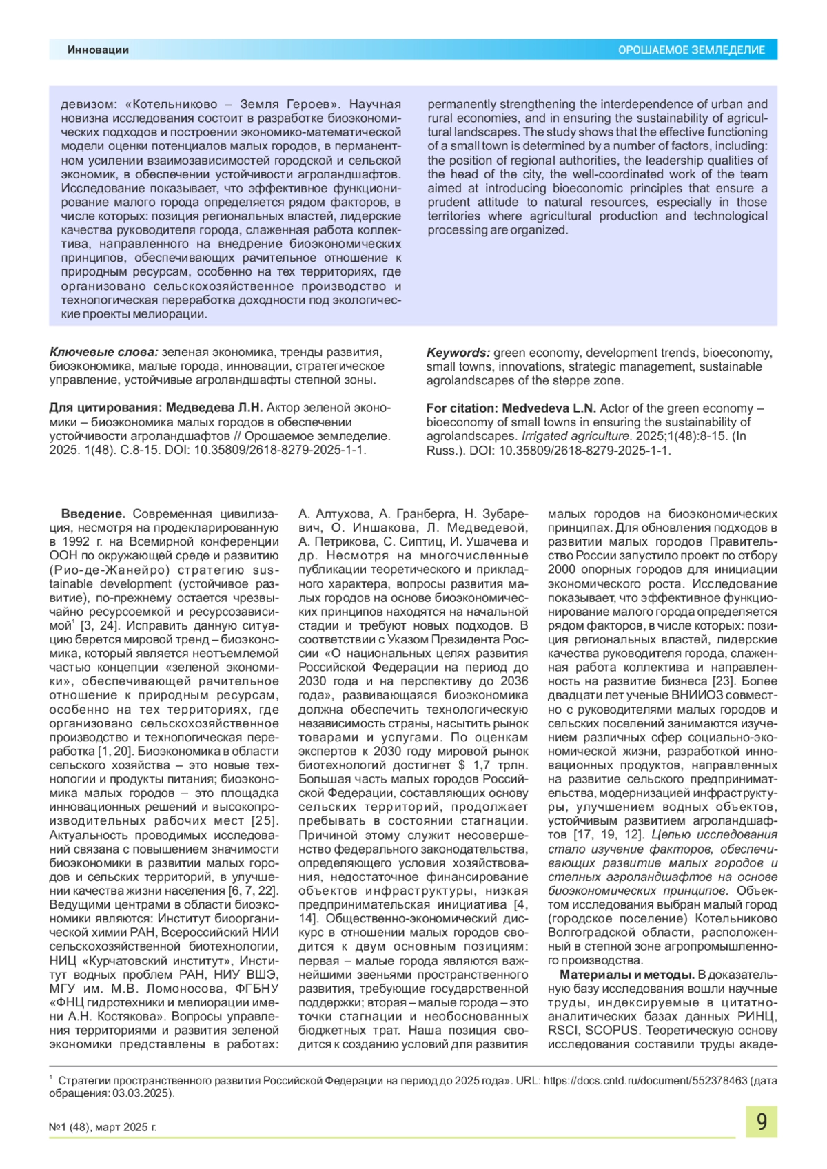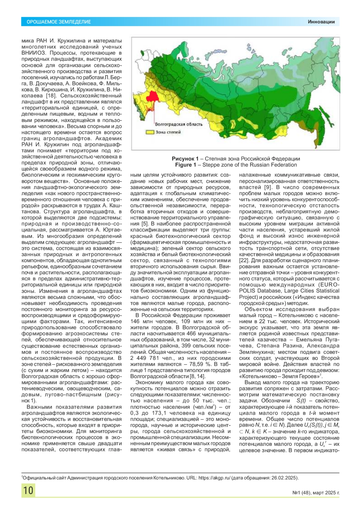 Актуальность проводимых исследований связана с повышением значимости биоэкономики в развитии малых городов, расположенных в сельской местности, в обеспечении устойчивости агроландшафтов, расположенных в степной зоне рискованного земледелия. Показаны современные подходы в управлении малыми городами, участвующими в промышленно-сельскохозяйственном труде с использованием биоэкономических принципов, которые являются неотъемлемой частью концепции «зеленой экономики». Отмечается значимость исследований, проводимых учеными ВНИИОЗ в развитии биоэкономики малых городов и устойчивого развития агроландшафтов. Несмотря на многочисленные публикации теоретического и прикладного характера, вопросы развития малых городов на основе биоэкономических подходов находятся на этапе поиска и научных размышлений. Правительством России принято решение о финансирования инфраструктуры 2000 городов для стабилизации «пространственного полотна» страны и повышении удовлетворённости человека трудом и качеством жизни. Целью исследования стало изучение факторов, обеспечивающих развитие малых городов, расположенных в степном агроландшафте, на основе биоэкономических подходов. В число задач вошли – изучение теории и практики применения биоэкономических подходов в развитии регионов и отраслей, формирование предложений, направленных на устойчивое развитие агроландшафтов, обеспечивающих повышение качества жизни населения. Объектом исследования выбран малый город (городское поселение) Котельниково Волгоградской области, расположенный в степной зоне агропромышленного производства, развивающийся под девизом: «Котельниково – Земля Героев». Научная новизна исследования состоит в разработке биоэкономических подходов и построении экономико-математической модели оценки потенциалов малых городов, в перманентном усилении взаимозависимостей городской и сельской экономик, в обеспечении устойчивости агроландшафтов. Исследование показывает, что эффективное функционирование малого города определяется рядом факторов, в числе которых: позиция региональных властей, лидерские качества руководителя города, слаженная работа коллектива, направленного на внедрение биоэкономических принципов, обеспечивающих рачительное отношение к природным ресурсам, особенно на тех территориях, где организовано сельскохозяйственное производство и технологическая переработка доходности под экологические проекты мелиорации.