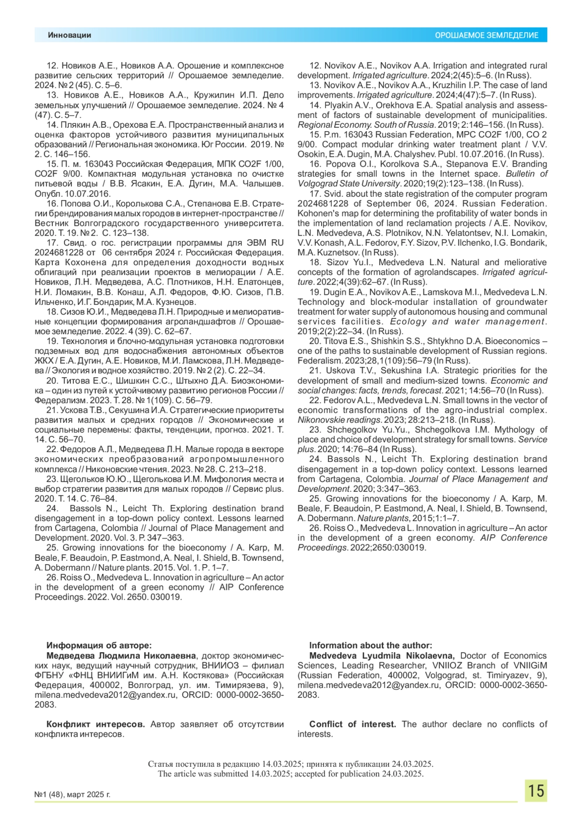 12. Новиков А.Е., Новиков А.А. Орошение и комплексное развитие сельских территорий // Орошаемое земледелие. 2024. № 2 (45). С. 5-6.
