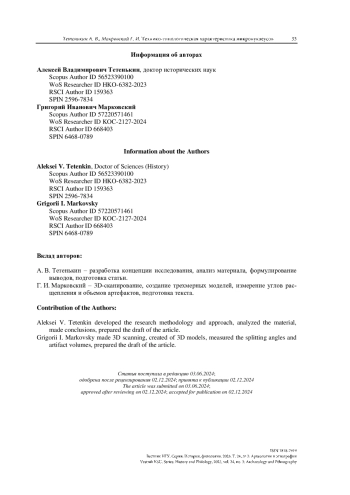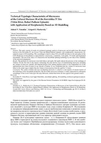 ТЕТЕНЬКИН А. В., МАРКОВСКИЙ Г. И. ТЕХНИКО-ТИПОЛОГИЧЕСКАЯ ХАРАКТЕРИСТИКА МИКРОНУКЛЕУСОВ 3Б КУЛЬТУРНОГО ГОРИЗОНТА СТОЯНКИ КОВРИЖКА IV (ВИТИМ, БАЙКАЛО-ПАТОМСКОЕ НАГОРЬЕ) С ПРИМЕНЕНИЕМ МОРФОМЕТРИИ НА ОСНОВЕ 3D-МОДЕЛИРОВАНИЯ // ВЕСТНИК НГУ. СЕРИЯ: ИСТОРИЯ, ФИЛОЛОГИЯ. 2025. ТОМ 24, № 3