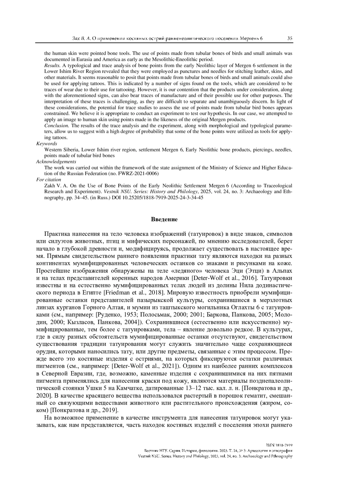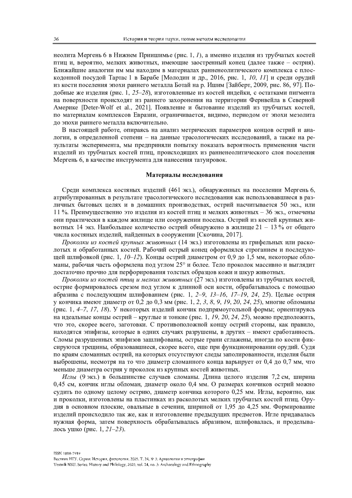 Острия из трубчатых костей птиц и мелких животных известны на территории Евразии и Америки уже в мезолит-энеолитическое время. На основе типологического и трасологического анализа костяных острий из ранненеолитического слоя Мергень 6 было показано, что они использовались как проколки и иглы для сшивания кож, шкур и т. д. Вместе с тем нельзя не предположить, что острия из трубчатых костей птиц и мелких животных могли применяться и для нанесения татуировок. Об этом говорит ряд признаков, диагностированных как следы износа вследствие использования для татуировок, на экспериментальных орудиях. Однако рассматриваемая категория изделий, наряду с таковыми признаками, выявленными с помощью трасологического анализа, вероятно, несет и следы изготовления, а также, возможно, употребления орудий в других целях, и эти следы трудно разделить и интерпретировать однозначно. В связи с этим возможности трасологических исследований для оценки применения острий представляются ограниченными. Была предпринята попытка нанести изображение на кожу человека остриями, изготовленными по подобию оригинальных мергенских изделий. Взятые в совокупности, результаты трасологического анализа и эксперимента вместе с морфолого-типологическими параметрами позволяют с высокой долей вероятности рассматривать некоторые острия в качестве инструментов для нанесения татуировок.