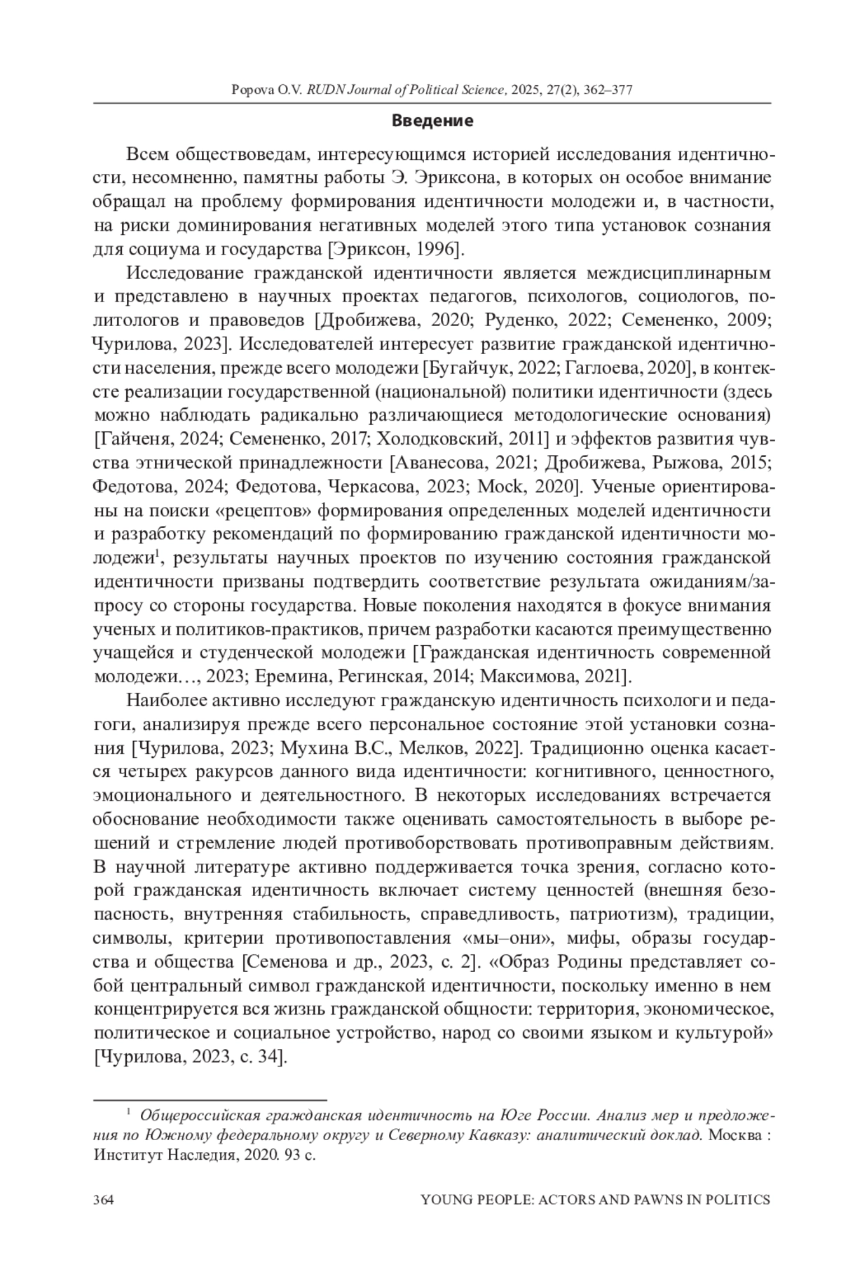 20. Федотова В.А., Черкасова Е.В. Социокультурные факторы формирования гражданской и этнической идентичности россиян: к постановке проблемы // Социально-гуманитарные знания. 2023. № 11. С. 138-143. EDN: LRSFWE