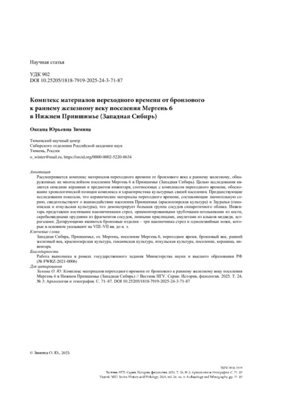 Рассматривается комплекс материалов переходного времени от бронзового века к раннему железному, обнаруженных на многослойном поселении Мергень 6 в Приишимье (Западная Сибирь). Целью исследования является описание керамики и предметов инвентаря, соотносимых с комплексом переходного времени, обоснование хронологической позиции комплекса и характеристика культурных связей населения. Предшествующие исследования показали, что керамические материалы переходного времени, составляющие значительную серию, свидетельствуют о взаимодействии населения Приишимья (красноозерская культура) и Зауралья (гамаюнская и иткульская культуры), что демонстрирует большая группа сосудов синкретичного облика. Инвентарь представлен костяными наконечниками стрел, орнаментированными трубочками-игольниками из кости, скребковидными орудиями из фрагментов сосудов, лепными пряслицами, амулетами из клыков медведя, астрагалами. Датирующими являются бронзовые изделия – три наконечника стрел и однолезвийные ножи, которые в основном указывают на VIII–VII вв. до н. э.