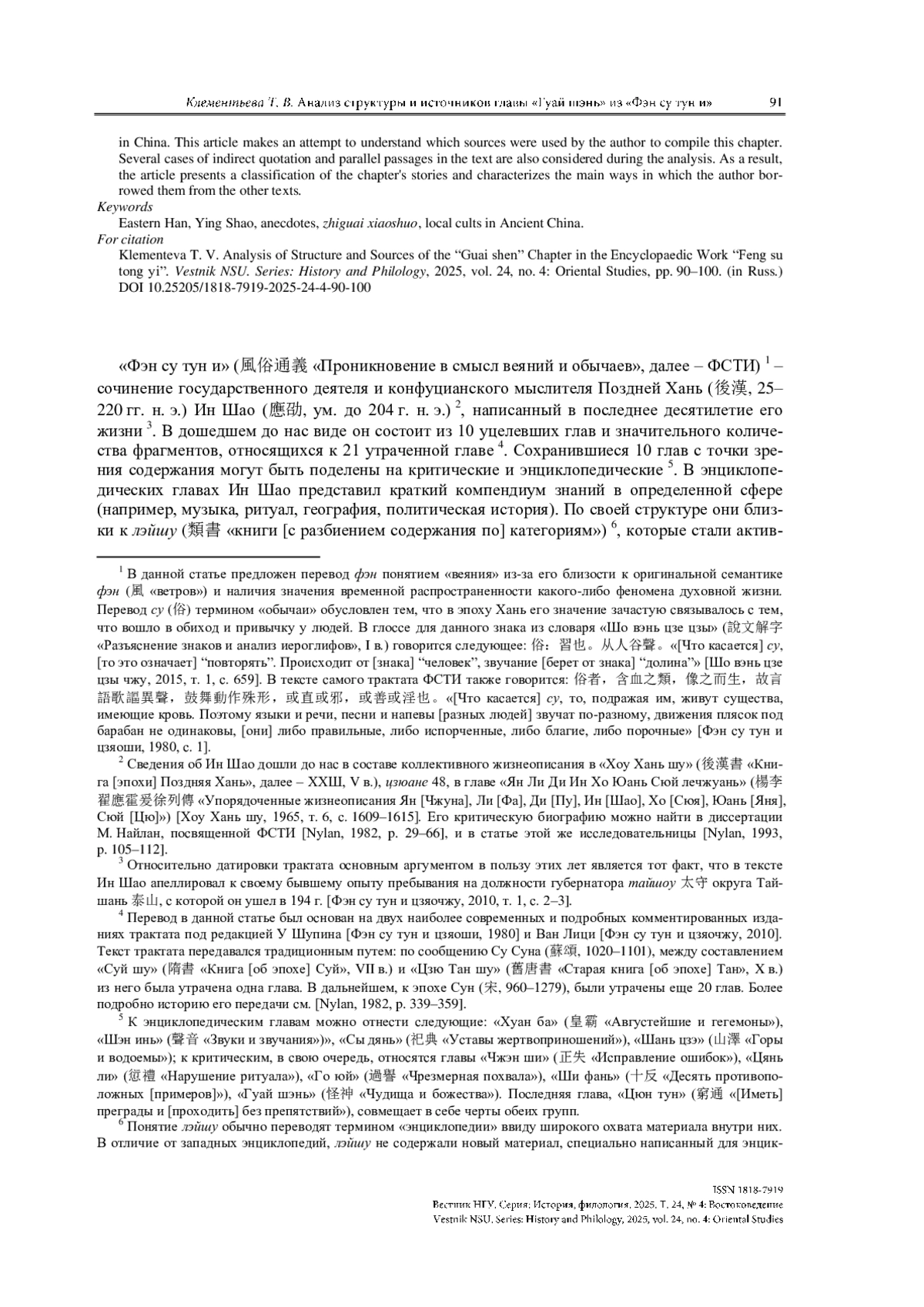 Cтатья посвящена источниковедческому анализу главы «Гуай шэнь» (怪神 «Чудища и божества»), входящей в состав сочинения «Фэн су тун и» (風俗通義 «Проникновение в смысл веяний и обычаев»). Оно было написано Ин Шао (應劭, ум. до 204 г. н. э.) – мыслителем-конфуцианцем и государственным деятелем, жившим в конце правления империи Восточной Хань. Глава представляет собой собрание анекдотических сюжетов о столкновениях человека со сверхъестественным и затрагивает одну из мало освещенных в древнекитайских текстах тем – локальные культы эпохи Хань (漢, 202 г. до н. э. – 220 г. н. э.). Предпринята попытка определить источниковую базу главы, рассматриваются вопросы непрямого цитирования и параллельных сюжетов. Представлена классификация этих сюжетов, и охарактеризованы пути заимствования автором вошедших в нее историй.