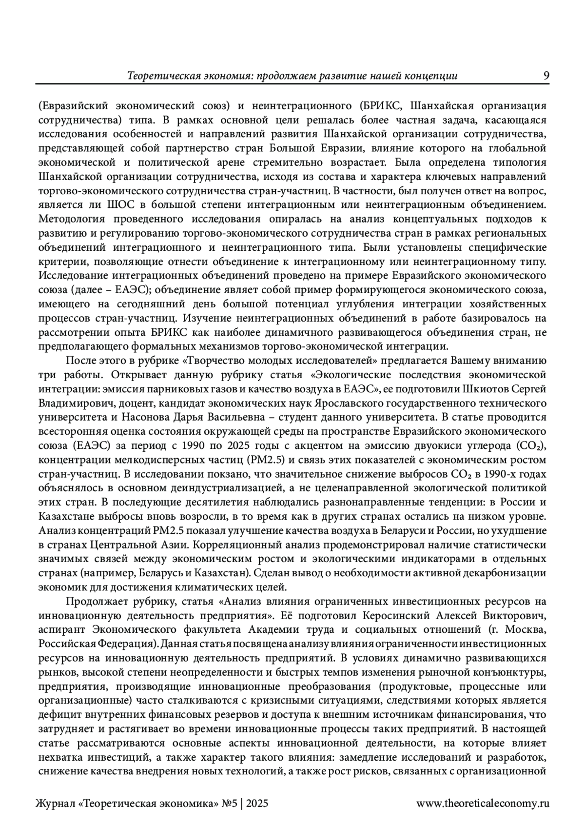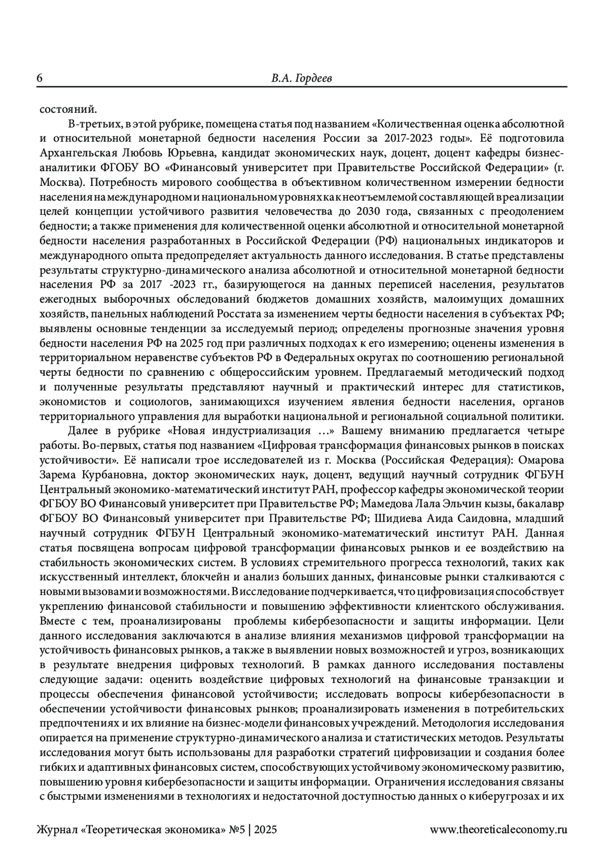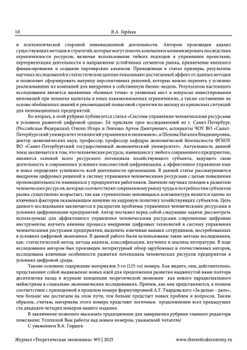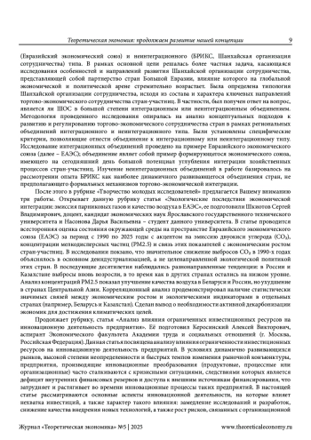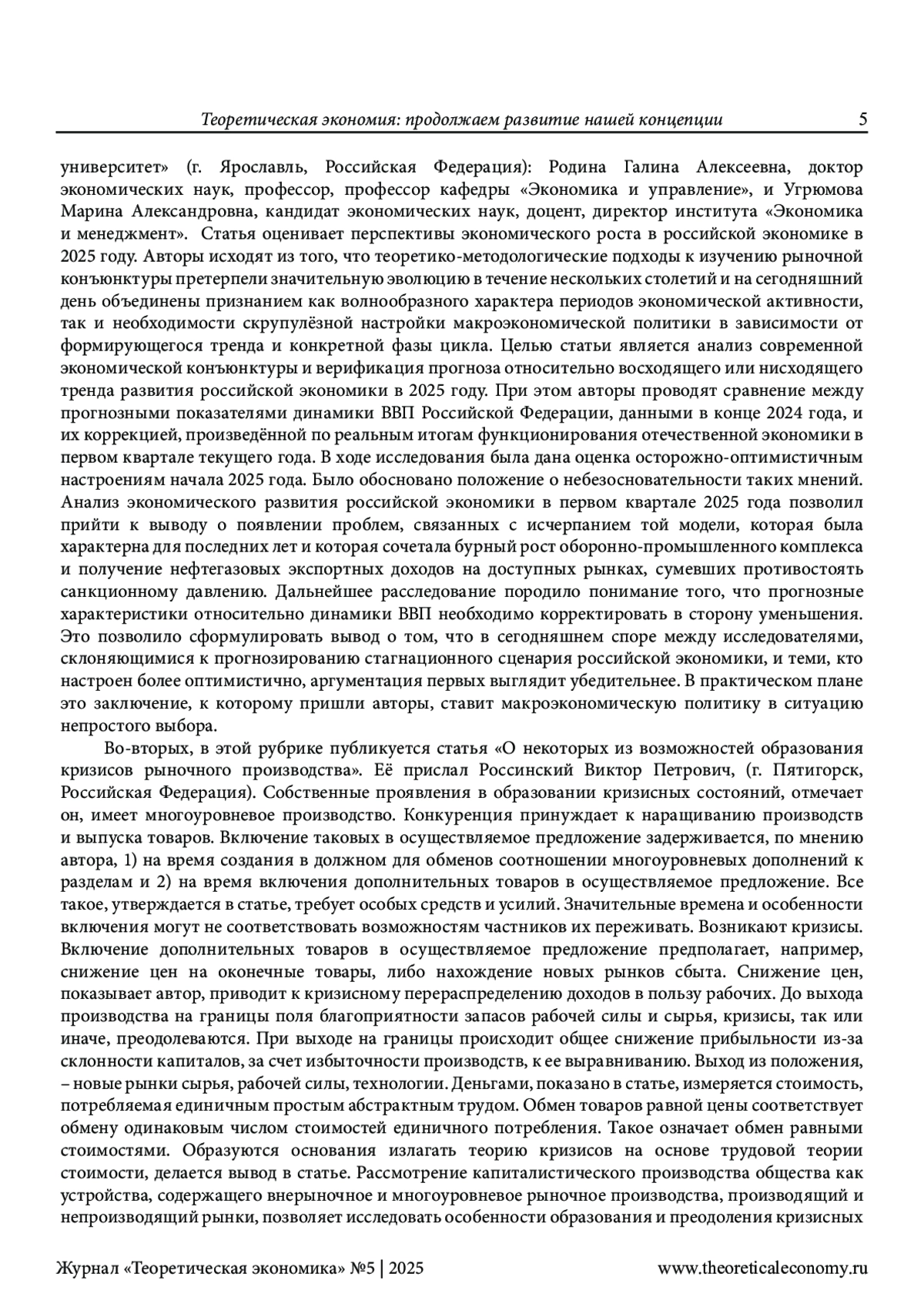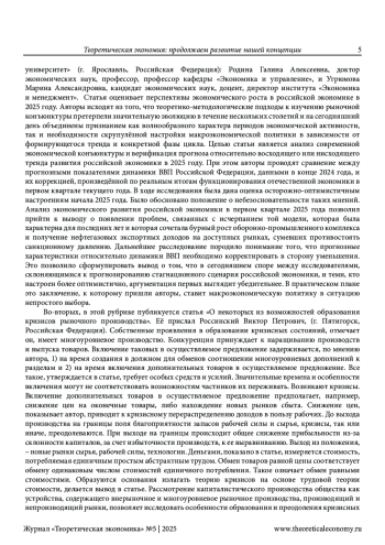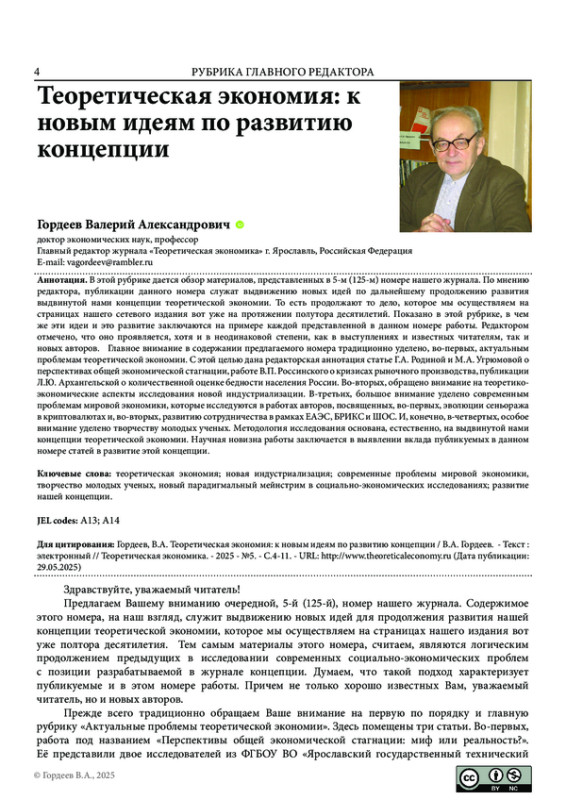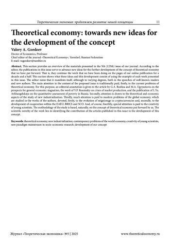 В этой рубрике дается обзор материалов, представленных в 5-м (125-м) номере нашего журнала. По мнению редактора, публикации данного номера служат выдвижению новых идей по дальнейшему продолжению развития выдвинутой нами концепции теоретической экономии. То есть продолжают то дело, которое мы осуществляем на страницах нашего сетевого издания вот уже на протяжении полутора десятилетий. Показано в этой рубрике, в чем же эти идеи и это развитие заключаются на примере каждой представленной в данном номере работы. Редактором отмечено, что оно проявляется, хотя и в неодинаковой степени, как в выступлениях и известных читателям, так и новых авторов. Главное внимание в содержании предлагаемого номера традиционно уделено, во-первых, актуальным проблемам теоретической экономии. С этой целью дана редакторская аннотация статье Г. А. Родиной и М. А. Угрюмовой о перспективах общей экономической стагнации, работе В. П. Россинского о кризисах рыночного производства, публикации Л. Ю. Архангельской о количественной оценке бедности населения России. Во-вторых, обращено внимание на теоретико-экономические аспекты исследования новой индустриализации. В-третьих, большое внимание уделено современным проблемам мировой экономики, которые исследуются в работах авторов, посвященных, во-первых, эволюции сеньоража в криптовалютах и, во-вторых, развитию сотрудничества в рамках ЕАЭС, БРИКС и ШОС. И, конечно, в-четвертых, особое внимание уделено творчеству молодых ученых. Методология исследования основана, естественно, на выдвинутой нами концепции теоретической экономии. Научная новизна работы заключается в выявлении вклада публикуемых в данном номере статей в развитие этой концепции.
