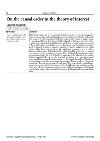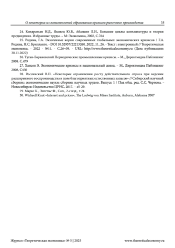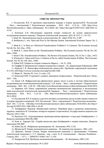 1. Россинский, В.П. О причинно-следственном порядке в теории процента/В.П. Россинский. - Текст: электронный // Теоретическая экономика. - 2024 - №12. - С.33-44. - URL: http://www.theoreticaleconomy.ru (Дата публикации: 30.12.2024). DOI: 10.52957/2221-3260-2024-12-33-44