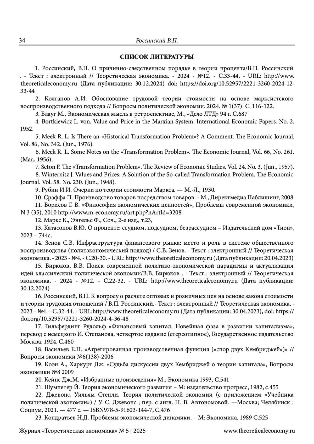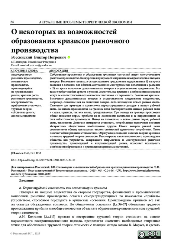 16. Россинский, В.П. К вопросу о расчете оптовых и розничных цен на основе закона стоимости и теории трудовых отношений / В.П. Россинский.- Текст: электронный // Теоретическая экономика. - 2023 - №4. - С.32-44. - URL:http://www.theoreticaleconomy.ru (Дата публикации: 30.04.2023),. DOI: 10.52957/2221-3260-2024-4-36-48