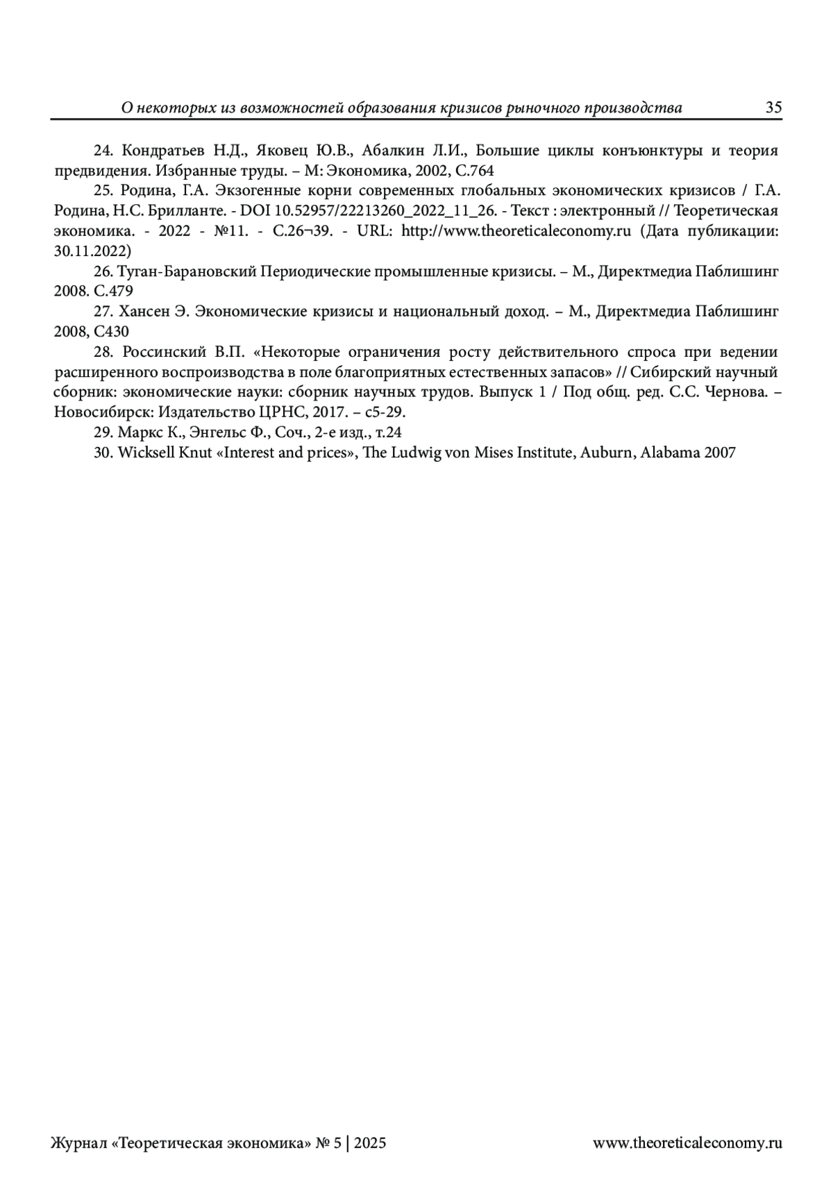 25. Родина, Г.А. Экзогенные корни современных глобальных экономических кризисов / Г.А. Родина, Н.С. Брилланте. 10.52957/22213260_2022_11_26. - Текст: электронный // Теоретическая экономика. - 2022 - №11. - С.2639. - URL: http://www.theoreticaleconomy.ru (Дата публикации: 30.11.2022). DOI: 10.52957/22213260_2022_11_26.-