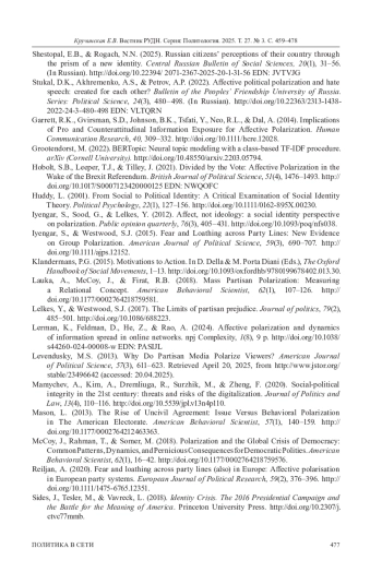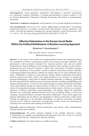 Ключевые фразы: политическая мобилизация, аффективная поляризация, язык ненависти, онлайн-коммуникация, машинное обучение, ТЕМАТИЧЕСКОЕ МОДЕЛИРОВАНИЕ