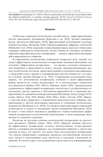 КРУЧИНСКАЯ Е. В. АНАЛИЗ АФФЕКТИВНОЙ ПОЛЯРИЗАЦИИ В РОССИЙСКОМ ОНЛАЙНПРОСТРАНСТВЕ В УСЛОВИЯХ ПОЛИТИЧЕСКОЙ МОБИЛИЗАЦИИ: ПОДХОД МАШИННОГО ОБУЧЕНИЯ // ВЕСТНИК РОССИЙСКОГО УНИВЕРСИТЕТА ДРУЖБЫ НАРОДОВ. СЕРИЯ: ПОЛИТОЛОГИЯ. 2025. Т. 27 № 3
