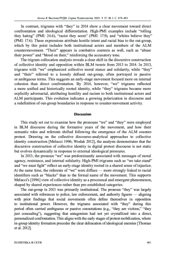 Трансформация коллективной идентичности в цифровом протестном дискурсе может фиксироваться с помощью отслеживания употребления местоимений первых и третьих лиц во множественном числе. Основываясь на теории коллективной идентичности и дискурсивном подходе, автор анализирует выборку из 100 000 твитов, опубликованных в период с июля 2013 г. по декабрь 2014 г., чтобы проследить использование местоимений «мы» и «они» до и после появления контрпротестного движения All Lives Matter. С применением триграммного коллокационного анализа и расчёта PMI (информационной взаимной значимости) выявляется переход от разрозненной и морально окрашенной внутригрупповой коллективной идентичности в 2013 г. к более устойчивой и политически оформленной идентичности в 2014 г. Одновременно изменяется и образ «других»: если в 2013 г. он был представлен преимущественно государственными институтами (например, полицией), то в 2014 г. он дополняется идеологическими оппонентами из гражданского общества. Полученные результаты подтверждают гипотезу о том, что появление контрпротестов изменило дискурсивные границы оппозиции, усилив поляризацию и дуализм в структуре коллективной идентичности. Работа вносит вклад в изучение взаимодействия протестов и контрпротестов, выявляя лингвистические механизмы формирования, оспаривания и перестройки групповой идентичности в условиях идеологического противостояния.