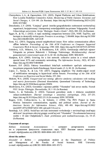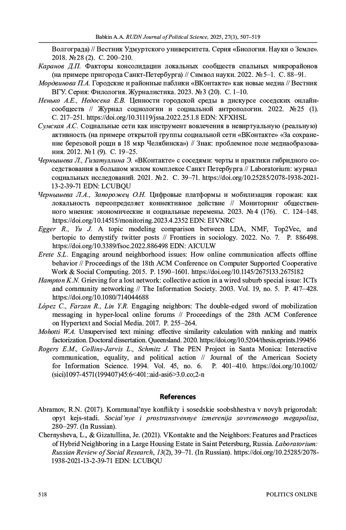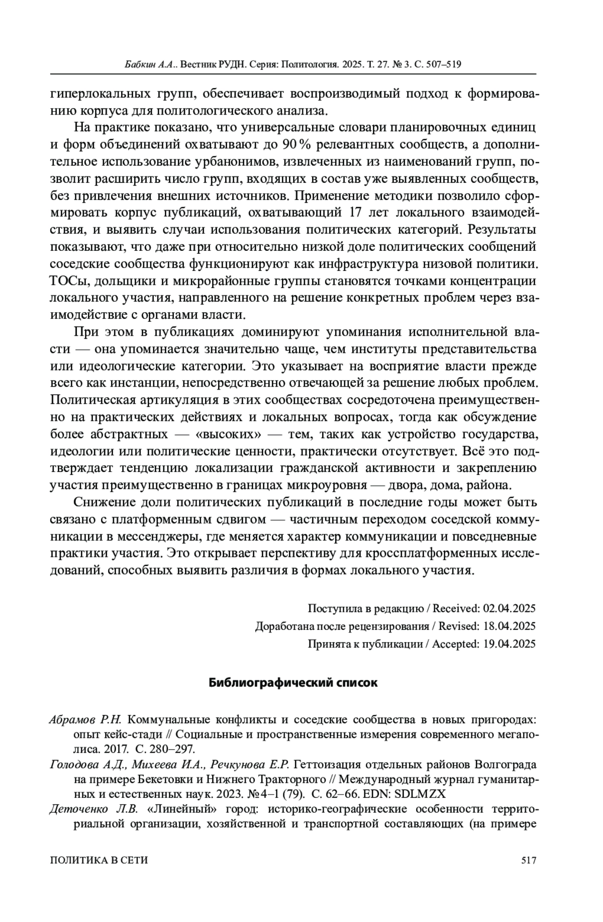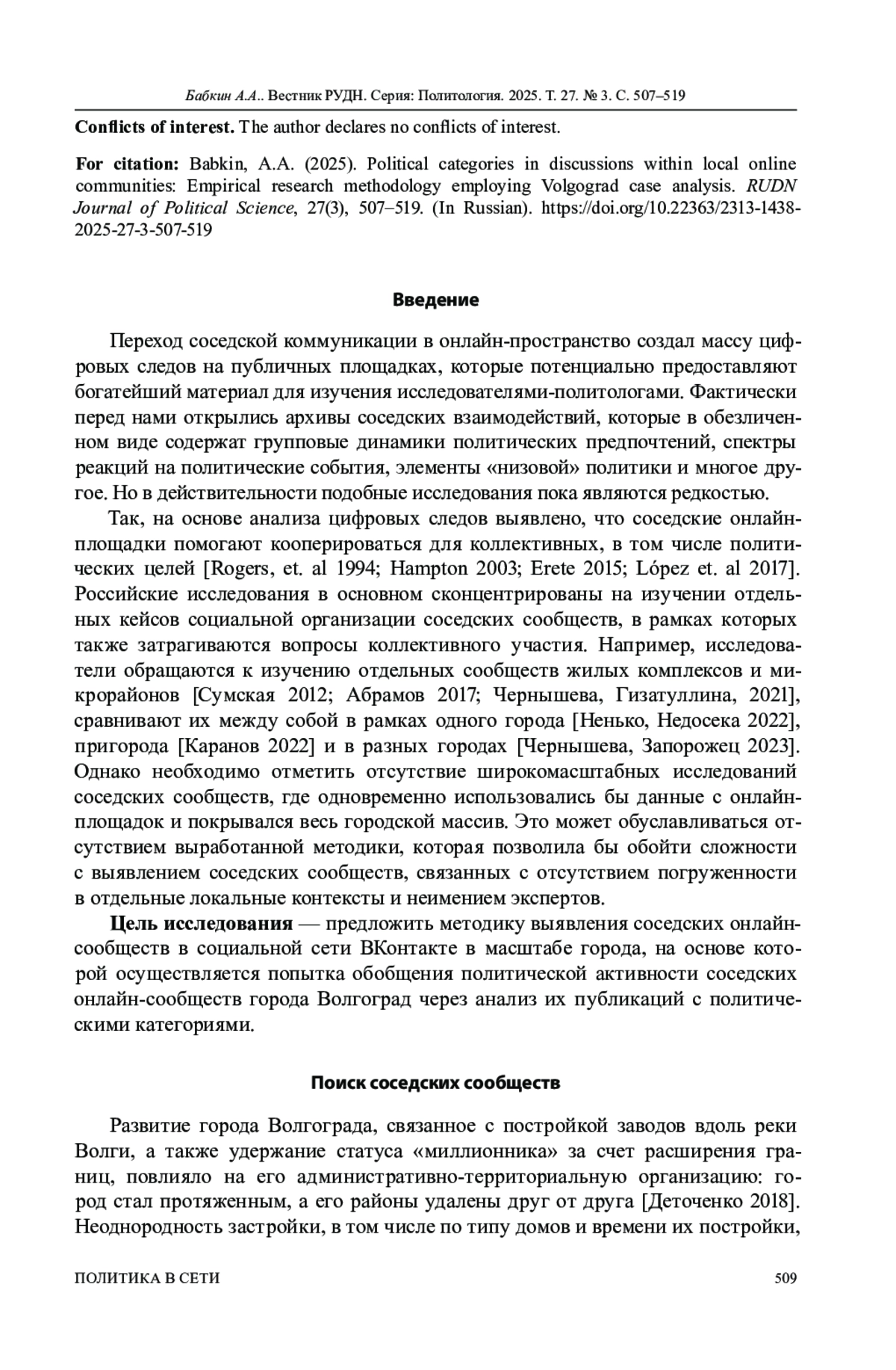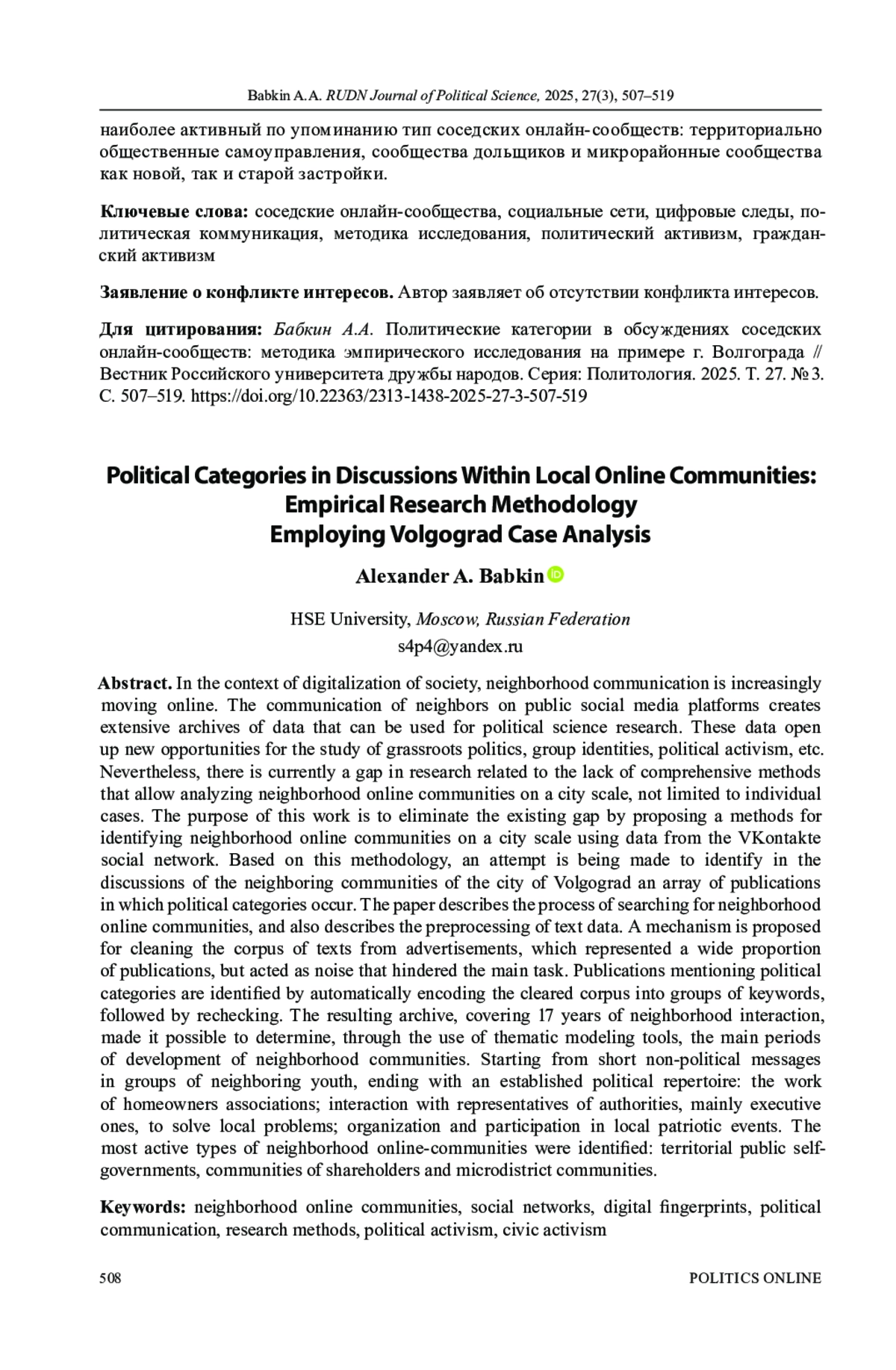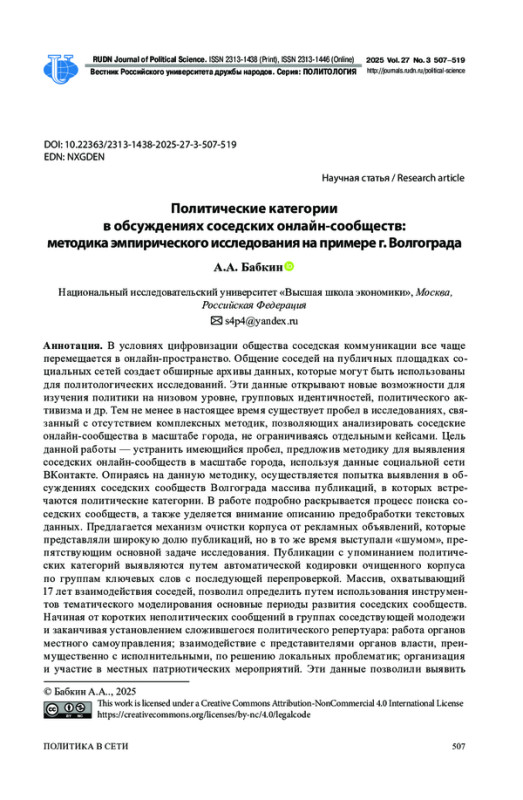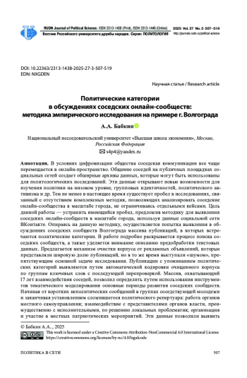 БАБКИН А. А. ПОЛИТИЧЕСКИЕ КАТЕГОРИИ В ОБСУЖДЕНИЯХ СОСЕДСКИХ ОНЛАЙН-СООБЩЕСТВ: МЕТОДИКА ЭМПИРИЧЕСКОГО ИССЛЕДОВАНИЯ НА ПРИМЕРЕ Г. ВОЛГОГРАДА // ВЕСТНИК РОССИЙСКОГО УНИВЕРСИТЕТА ДРУЖБЫ НАРОДОВ. СЕРИЯ: ПОЛИТОЛОГИЯ. 2025. Т. 27 № 3