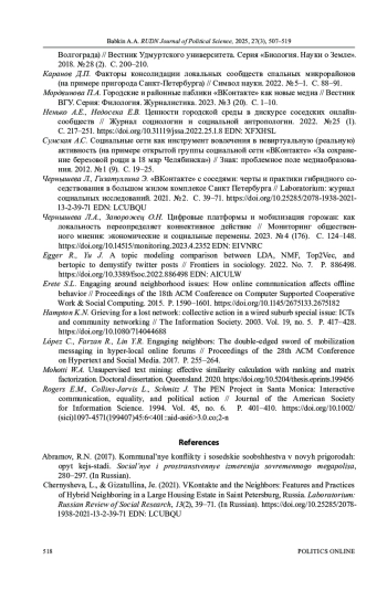 В условиях цифровизации общества соседская коммуникации все чаще перемещается в онлайн-пространство. Общение соседей на публичных площадках социальных сетей создает обширные архивы данных, которые могут быть использованы для политологических исследований. Эти данные открывают новые возможности для изучения политики на низовом уровне, групповых идентичностей, политического активизма и др. Тем не менее в настоящее время существует пробел в исследованиях, связанный с отсутствием комплексных методик, позволяющих анализировать соседские онлайн-сообщества в масштабе города, не ограничиваясь отдельными кейсами. Цель данной работы - устранить имеющийся пробел, предложив методику для выявления соседских онлайн-сообществ в масштабе города, используя данные социальной сети ВКонтакте. Опираясь на данную методику, осуществляется попытка выявления в обсуждениях соседских сообществ Волгограда массива публикаций, в которых встречаются политические категории. В работе подробно раскрывается процесс поиска соседских сообществ, а также уделяется внимание описанию предобработки текстовых данных. Предлагается механизм очистки корпуса от рекламных объявлений, которые представляли широкую долю публикаций, но в то же время выступали «шумом», препятствующим основной задаче исследования. Публикации с упоминанием политических категорий выявляются путем автоматической кодировки очищенного корпуса по группам ключевых слов с последующей перепроверкой. Массив, охватывающий 17 лет взаимодействия соседей, позволил определить путем использования инструментов тематического моделирования основные периоды развития соседских сообществ. Начиная от коротких неполитических сообщений в группах соседствующей молодежи и заканчивая установлением сложившегося политического репертуара: работа органов местного самоуправления; взаимодействие с представителями органов власти, преимущественно с исполнительными, по решению локальных проблематик; организация и участие в местных патриотических мероприятий. Эти данные позволили выявить наиболее активный по упоминанию тип соседских онлайн-сообществ: территориально общественные самоуправления, сообщества дольщиков и микрорайонные сообщества как новой, так и старой застройки.