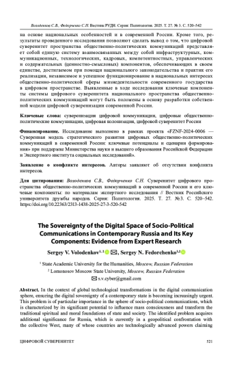 В условиях глобальных технологических трансформаций цифровой коммуникационной сферы актуализируется проблема обеспечения цифрового суверенитета современного государства. Особо важное значение данная проблема имеет в сфере общественно-политических коммуникаций, характеризующейся значительным потенциалом воздействия на массовое сознание и трансформации традиционных духовно-нравственных и ценностно-смысловых основ жизнедеятельности государства и общества. Дополнительную значимость обозначенная проблема приобретает для России, находящейся в настоящее время в ситуации геополитического противостояния с коллективным Западом, многие страны которого являются технологически развитыми державами, претендующими на доминирующую роль в цифровом пространстве. Авторами изучены актуальные практики цифровизации в различных государствах мира, а также проведено международное экспертное исследование, на основе анализа результатов которого было сделано несколько ключевых выводов относительно содержания, структуры и степени универсальности моделей обеспечения суверенитета цифрового пространства общественно-политических коммуникаций. По итогам работы авторы приходят к выводу о том, что процессы суверенизации в современных государствах обладают национальной спецификой, что ставит вопрос о необходимости разработки модели цифровой суверенизации на основе национальных особенностей и в современной России. Кроме того, результаты проведенного исследования позволяют сделать вывод о том, что цифровой суверенитет пространства общественно-политических коммуникаций представляет собой единую систему взаимосвязанных между собой инфраструктурных, коммуникационных, технологических, кадровых, компетентностных, управленческих и содержательных (ценностно-смысловых) компонентов, обеспечивающих в своем единстве, достигаемом при помощи национального законодательства и практик его реализации, независимое и успешное функционирование в национальных интересах общественно-политической сферы жизнедеятельности современного государства в цифровом пространстве. Выявленные в ходе исследования ключевые компоненты системы цифрового суверенитета национального пространства общественно-политических коммуникаций могут быть положены в основу разработки собственной модели цифровой суверенизации современной России.