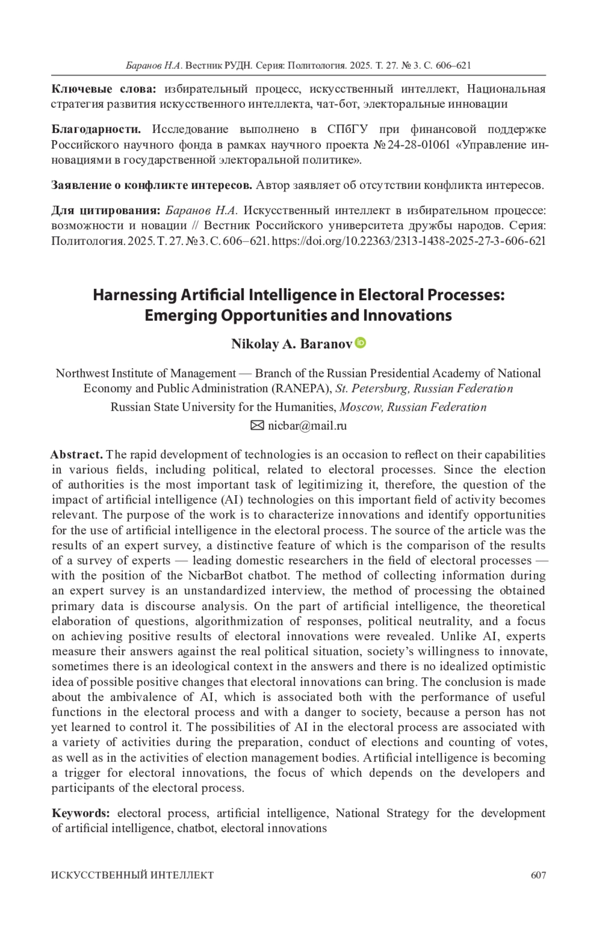 Стремительное развитие технологий служит поводом для осмысления их возможностей в различных сферах, в том числе политической, связанной с электоральными процессами. Так как избрание органов власти является важнейшей задачей ее легитимизации, актуальным становится вопрос о влиянии технологий искусственного интеллекта (ИИ) на эту важнейшую сферу деятельности. Цель работы - характеристика новаций и выявление возможностей при применении искусственного интеллекта в избирательном процессе. Источником статьи стали результаты экспертного опроса, отличительной особенностью которого является сопоставление результатов опроса экспертов - ведущих отечественных исследователей в области избирательных процессов - с позицией чат-бота NicbarBot. Метод сбора информации при проведении экспертного опроса - нестандартизованное интервью, метод обработки полученных первичных данных - дискурс-анализ. Со стороны искусственного интеллекта выявлена теоретическая проработанность вопросов, алгоритмизация ответов, политическая нейтральность, нацеленность на достижение положительных результатов электоральных новаций. В отличие от ИИ эксперты соизмеряют свои ответы с реальной политической ситуацией, готовностью общества к новациям, иногда прослеживается идеологический контекст в ответах и отсутствует идеализированное оптимистичное представление о возможных позитивных изменениях, которые могут привнести электоральные инновации. Сделан вывод об амбивалентности ИИ, которая связана как с выполнением полезных функций в избирательном процессе, так и с опасностью для общества, потому что человек еще не научился его контролировать. Возможности ИИ в электоральном процессе связаны с разнообразной деятельностью в период подготовки, проведения выборов и подсчета голосов, а также в деятельности органов управления выборами. Искусственный интеллект становится триггером электоральных новаций, направленность которых зависит от разработчиков и участников избирательного процесса.