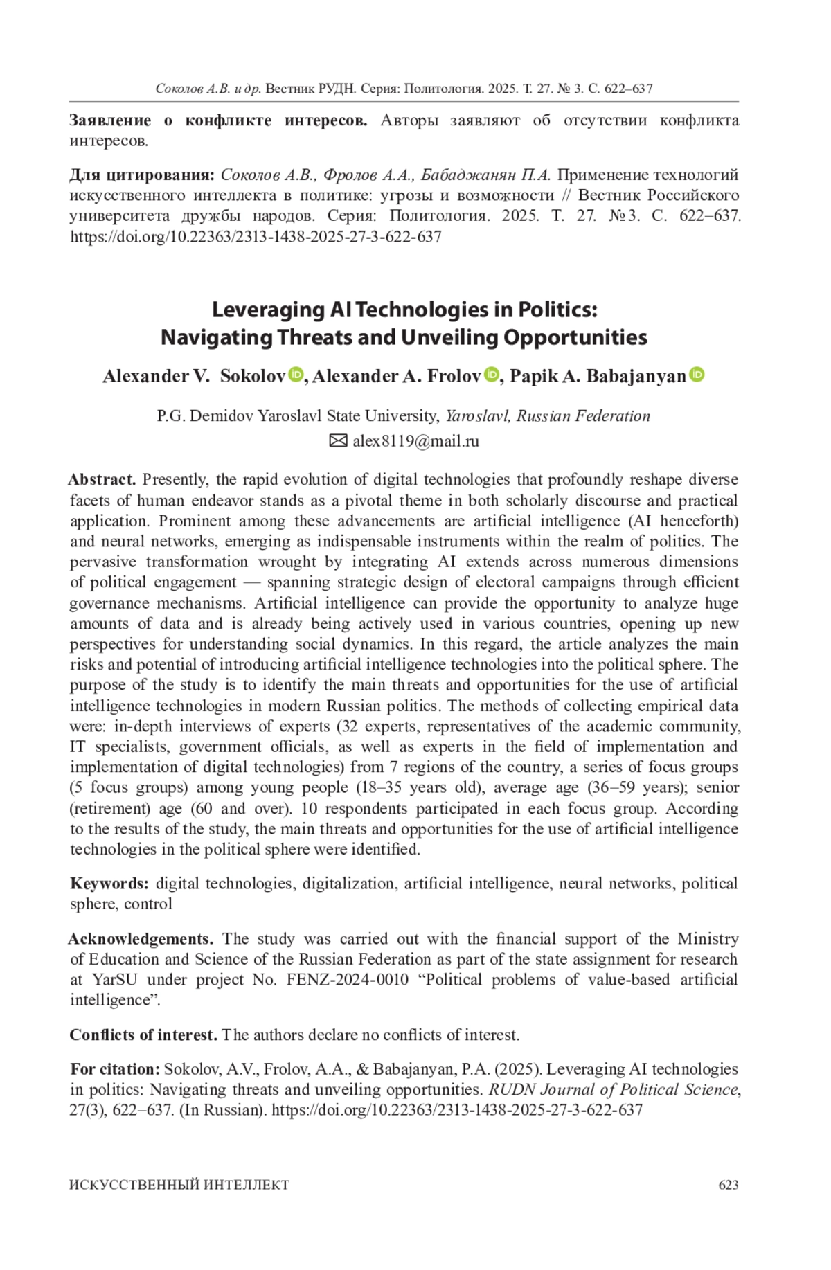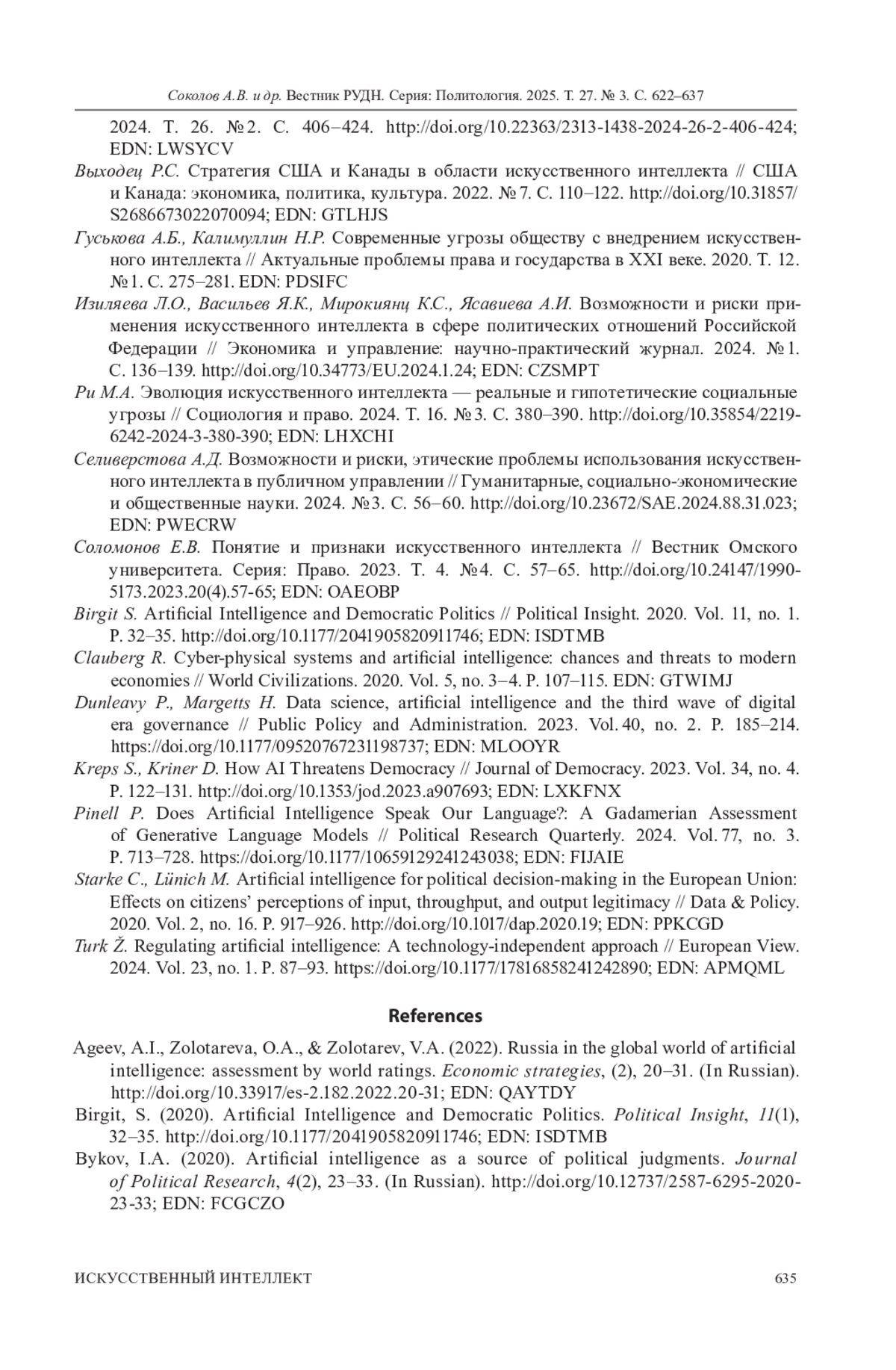 7. Изиляева Л.О., Васильев Я.К., Мирокиянц К.С., Ясавиева А.И. Возможности и риски применения искусственного интеллекта в сфере политических отношений Российской Федерации // Экономика и управление: научно-практический журнал. 2024. № 1. С. 136-139. ;. DOI: 10.34773/EU.2024.1.24 EDN: CZSMPT