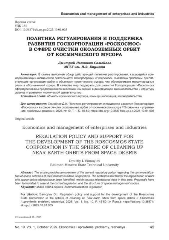 В статье выполнен обзор действующей политики регулирования, касающейся коммерциализации космической деятельности Госкорпорации «Роскосмос». Выявлены проблемы, препятствующие организации работ с объектами космического мусора, что обусловливает международные риски в обозначенной сфере. В качестве мер поддержки для развития Госкорпорации «Роскосмос» сформулированы предложения по внесению изменений в действующее законодательство и структуру органов управления космической деятельностью.