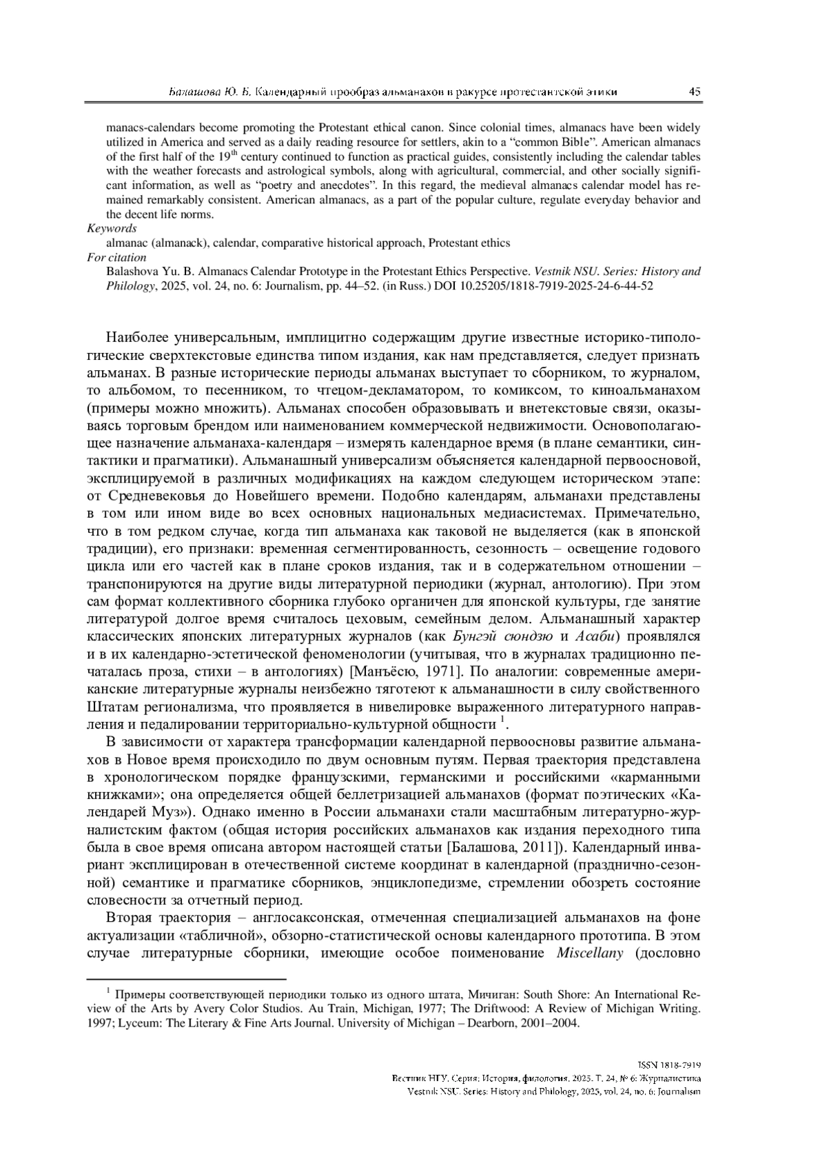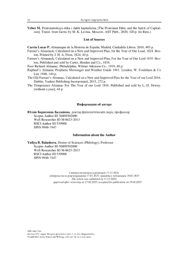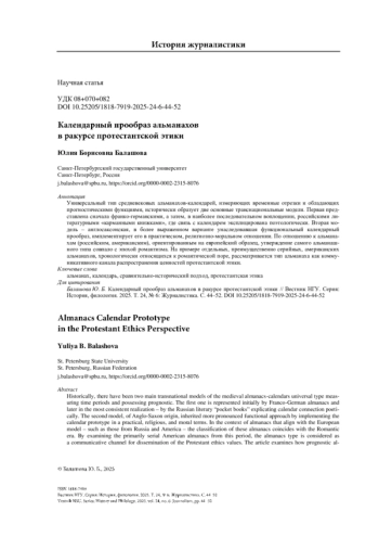 БАЛАШОВА Ю. Б. КАЛЕНДАРНЫЙ ПРООБРАЗ АЛЬМАНАХОВ В РАКУРСЕ ПРОТЕСТАНТСКОЙ ЭТИКИ // ВЕСТНИК НГУ. СЕРИЯ: ИСТОРИЯ, ФИЛОЛОГИЯ. 2025. ТОМ 24, № 6