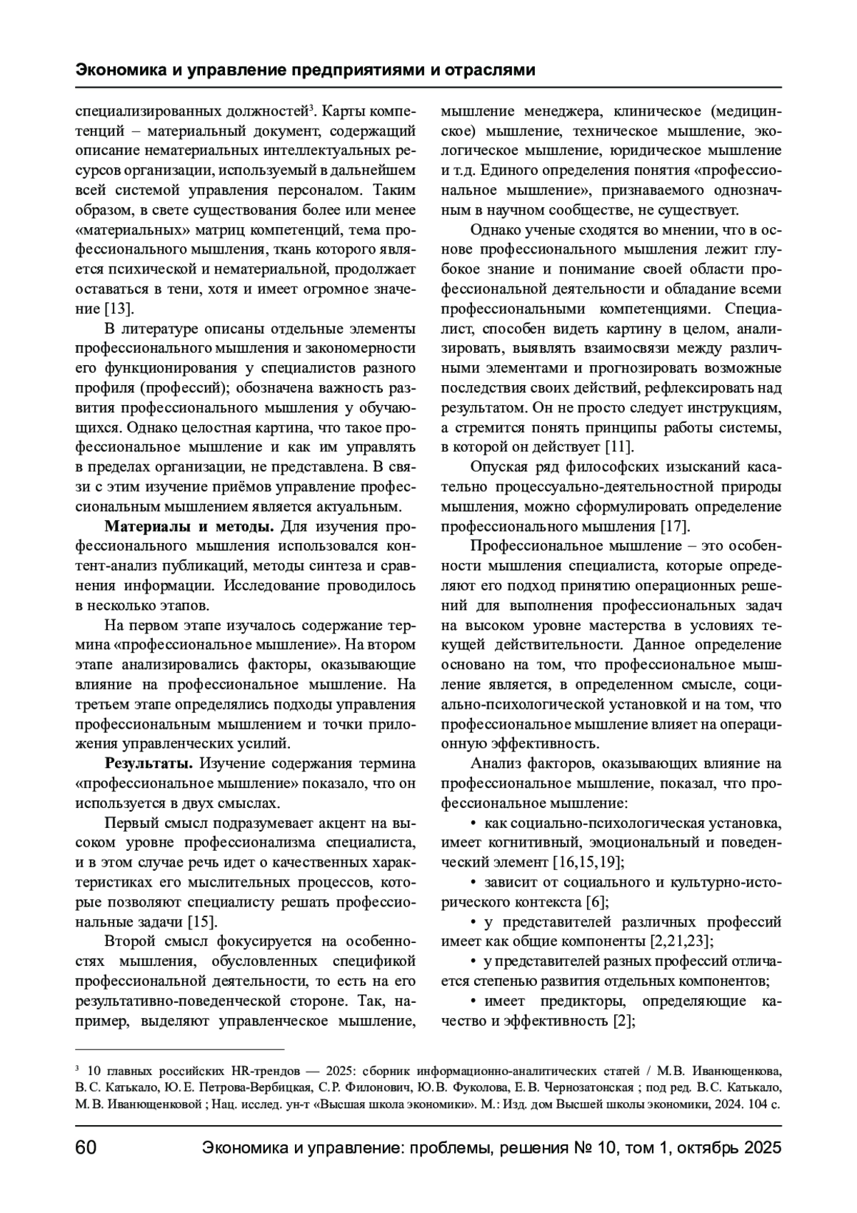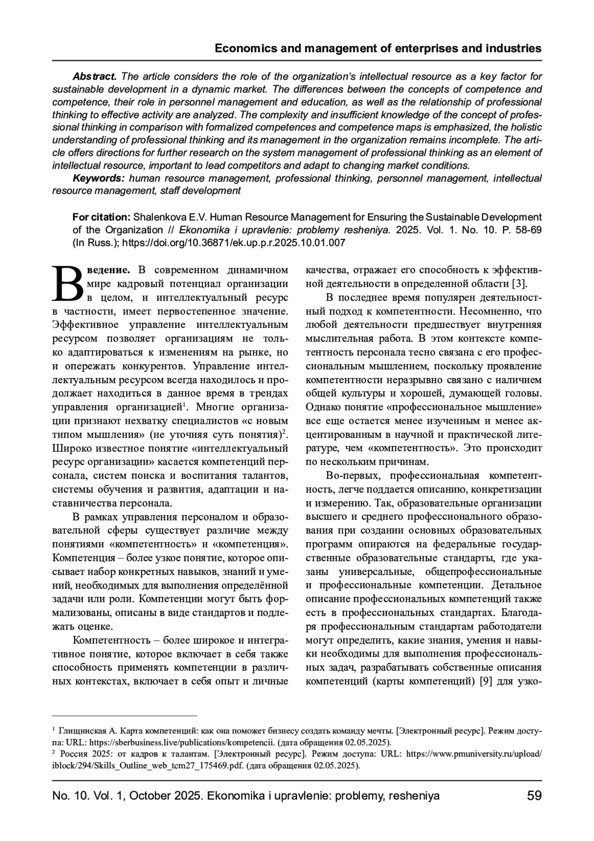 В статье рассматривается роль интеллектуального ресурса организации как ключевого фактора устойчивого развития в условиях динамичного рынка. Анализируются различия между понятиями компетентность и компетенция, их роль в управлении персоналом и образовании, а также связь профессионального мышления с эффективной деятельностью. Подчёркнута сложность и недостаточная изученность концепции профессионального мышления по сравнению с формализованными компетенциями и картами компетенций, целостное представление о профессиональном мышлении и его управлении в организации остаётся неполным. В статье обосновывается система управления профессиональным мышлением как элементом интеллектуального ресурса, важного для опережения конкурентов и адаптации к изменяющимся условиям рынка.