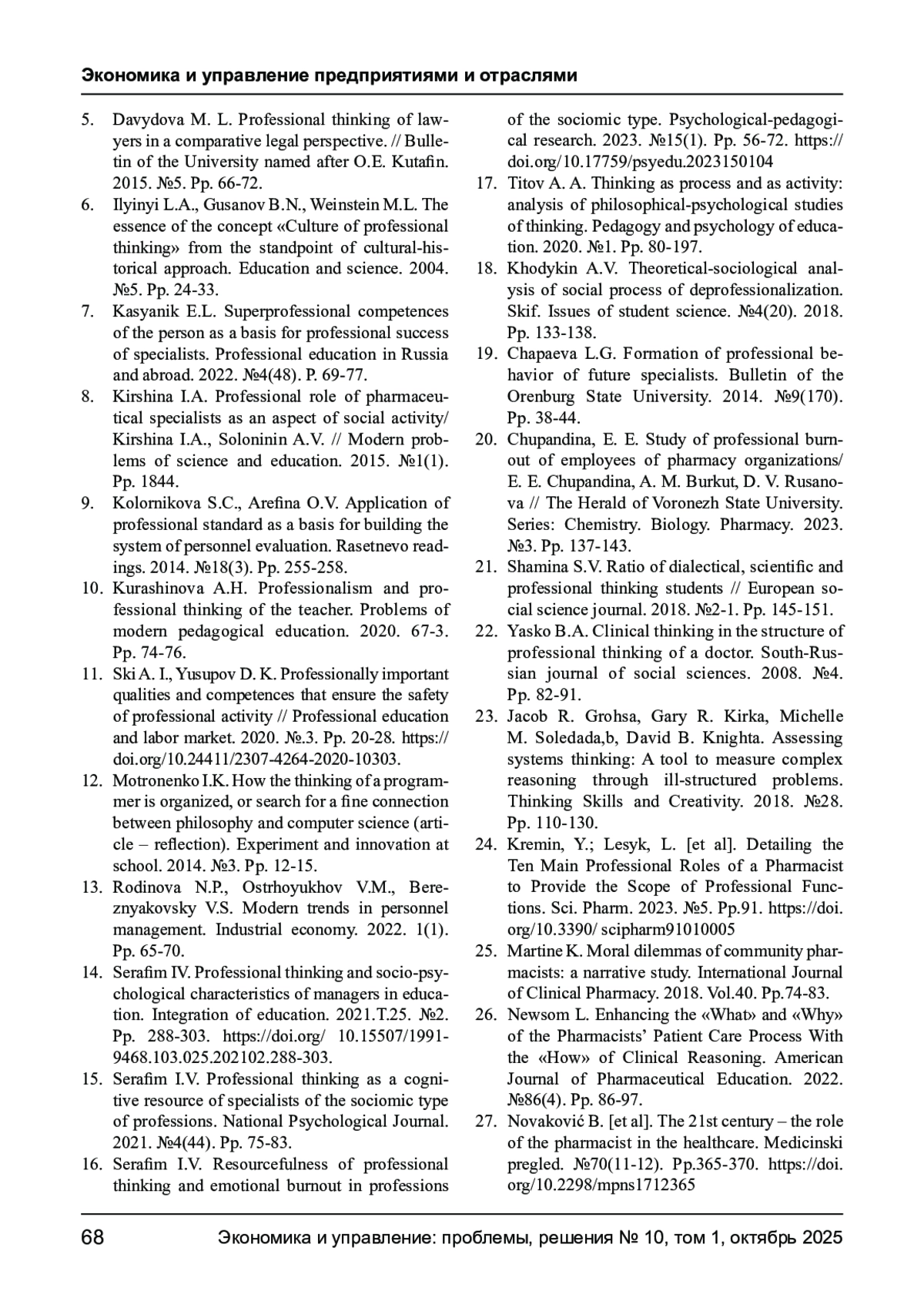24. Kremin, Y.; Lesyk, L. [et al]. Detailing the Ten Main Professional Roles of a Pharmacist to Provide the Scope of Professional Functions. Sci. Pharm. 2023. № 5. С. 91. DOI: 10.3390/scipharm91010005