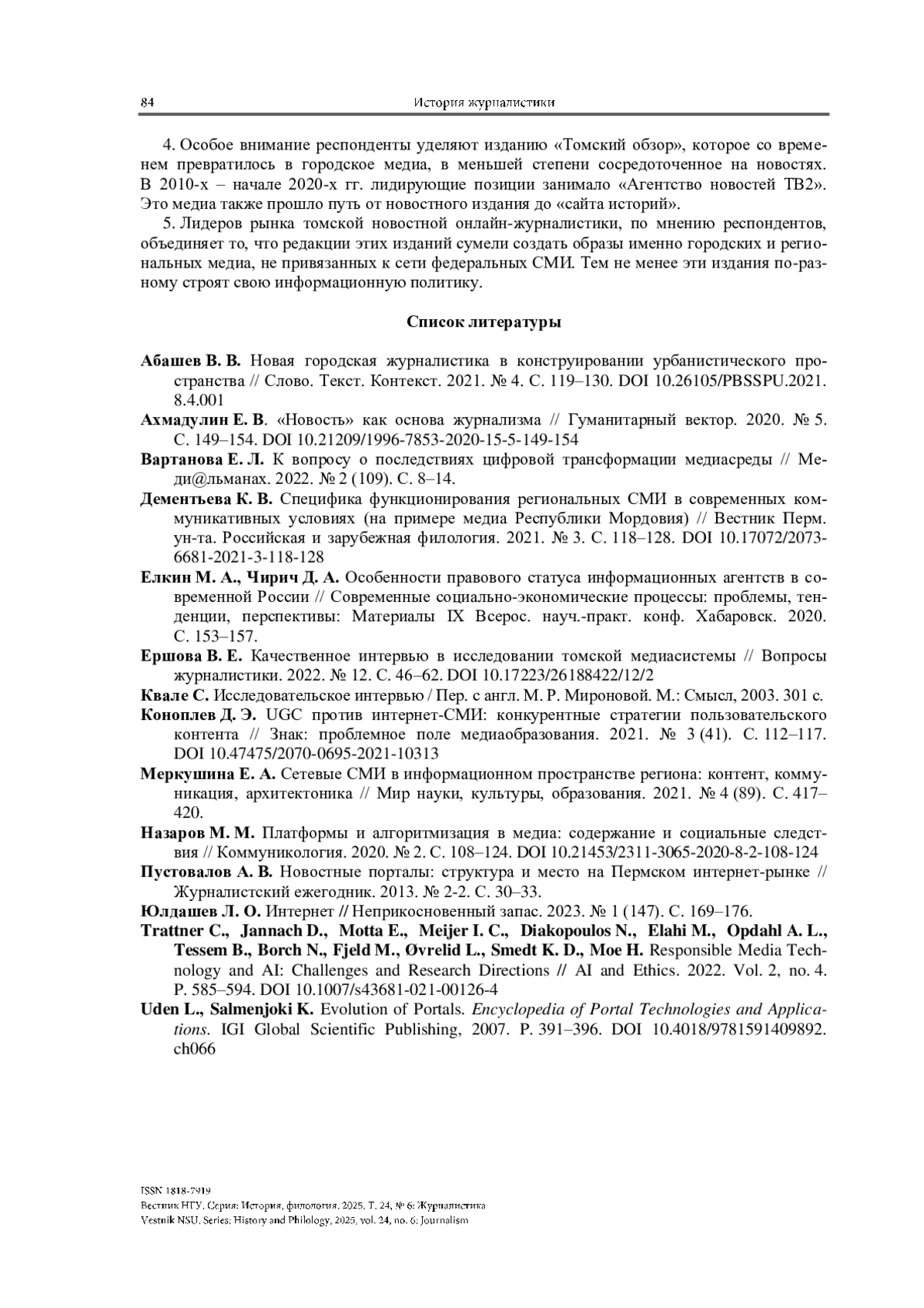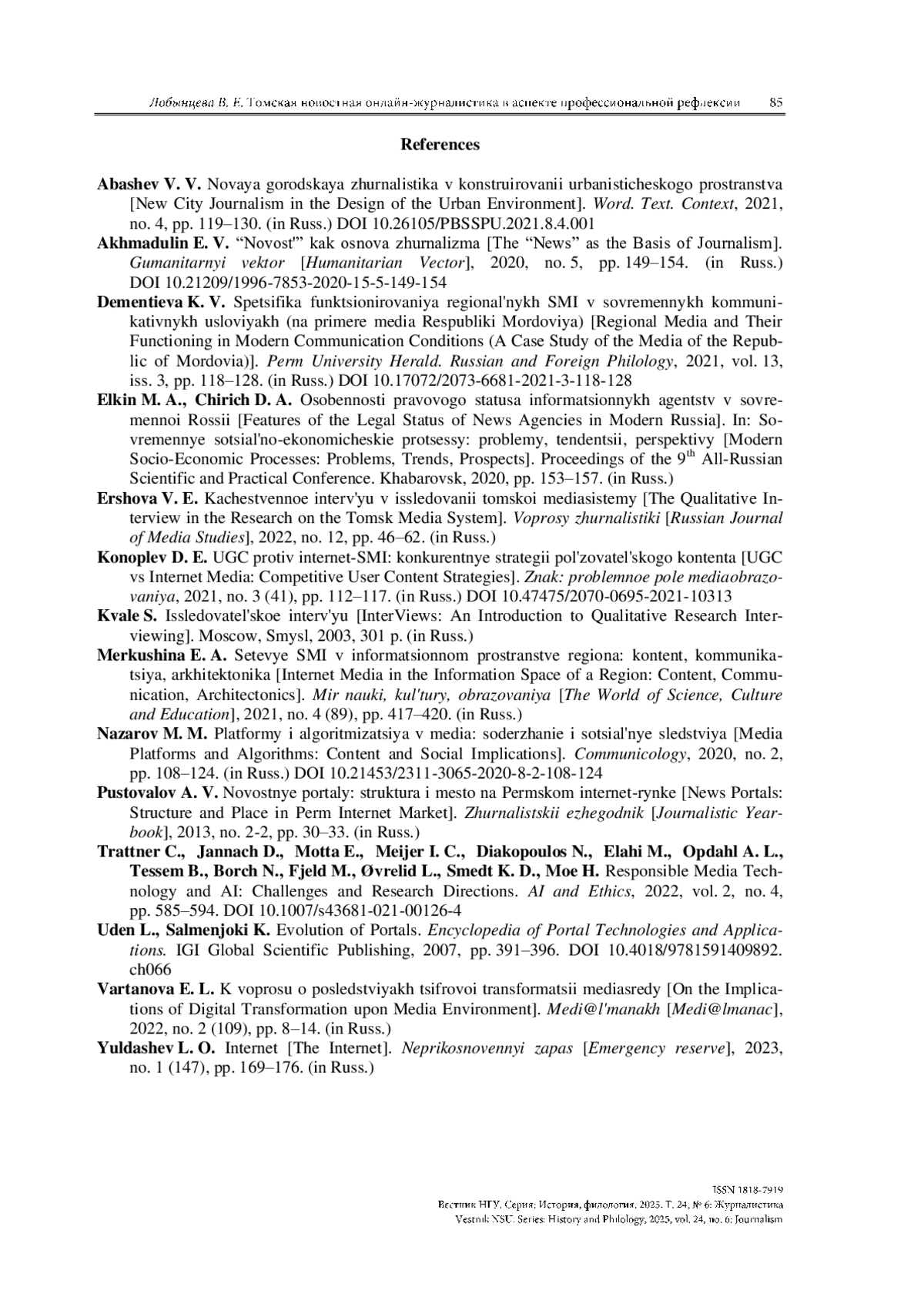 ЛОБЫНЦЕВА В. Е. ТОМСКАЯ НОВОСТНАЯ ОНЛАЙН-ЖУРНАЛИСТИКА В АСПЕКТЕ ПРОФЕССИОНАЛЬНОЙ РЕФЛЕКСИИ // ВЕСТНИК НГУ. СЕРИЯ: ИСТОРИЯ, ФИЛОЛОГИЯ. 2025. ТОМ 24, № 6