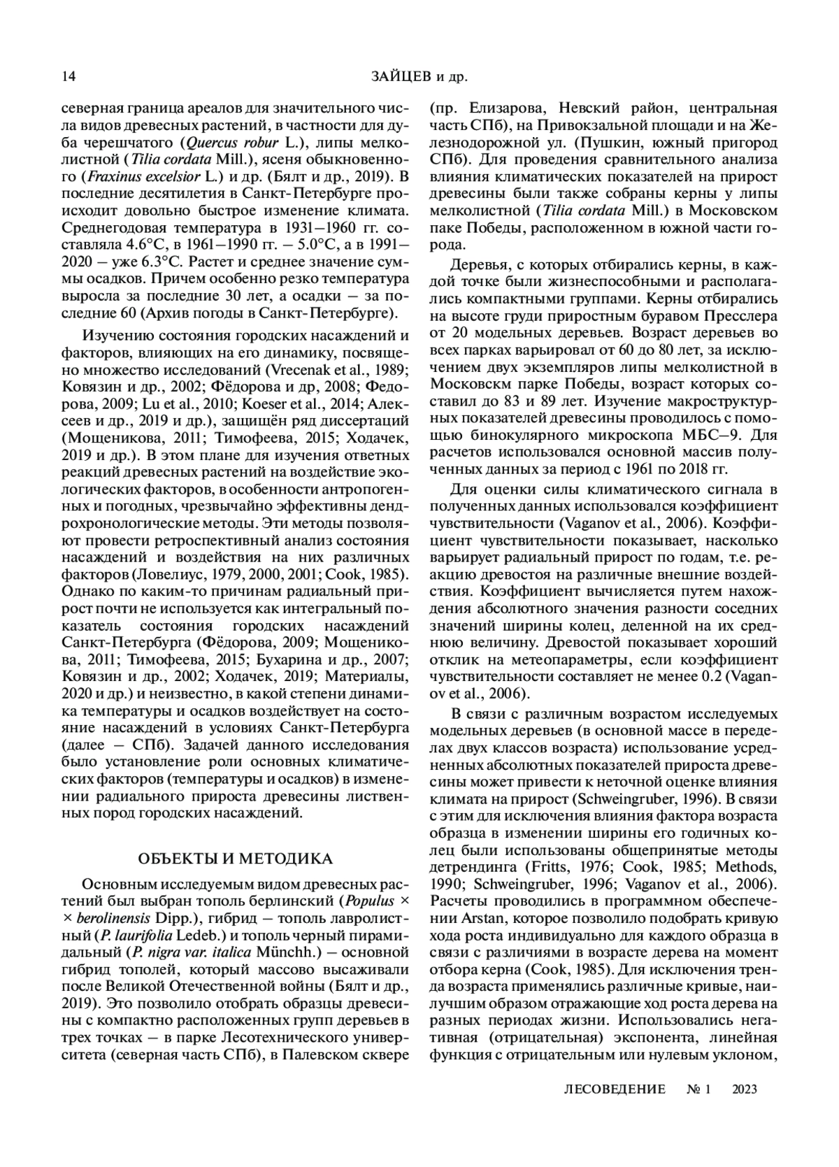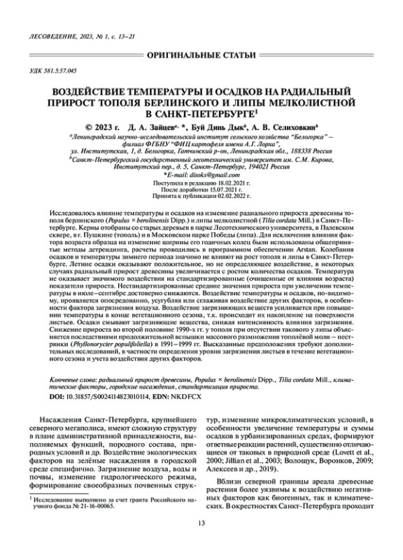 Исследовалось влияние температуры и осадков на изменение радиального прироста древесины тополя берлинского (Populus × berolinensis Dipp.) и липы мелколистной (Tilia cordata Mill.) в Санкт-Петербурге. Керны отобраны со старых деревьев в парке Лесотехнического университета, в Палевском сквере, в г. Пушкине (тополь) и в Московском парке Победы (липа). Для исключения влияния фактора возраста образца на изменение ширины его годичных колец были использованы общепринятые методы детрендинга, расчеты проводились в программном обеспечении Arstan. Колебания осадков и температуры зимнего периода значимо не влияют на рост тополя и липы в Санкт-Петербурге. Летние осадки оказывают положительное, но не определяющее воздействие, в некоторых случаях радиальный прирост древесины увеличивается с ростом количества осадков. Температура не оказывает значимого воздействия на стандартизированные (очищенные от влияния возраста) показатели прироста. Нестандартизированные средние значения прироста при увеличении температуры в июле–сентябре достоверно снижаются. Воздействие температуры и осадков, по-видимому, проявляется опосредованно, усугубляя или сглаживая воздействие других факторов, в особенности фактора загрязнения воздуха. Воздействие загрязняющих веществ усиливается при повышении температуры в конце вегетационного сезона, т. к. происходит их накопление на поверхности листьев. Осадки смывают загрязняющие вещества, снижая интенсивность влияния загрязнения. Снижение прироста во второй половине 1990-х гг. у тополя при отсутствии такового у липы объясняется последствиями продолжительной вспышки массового размножения тополёвой моли – пестрянки (Phyllonorycter populifoliella) в 1991–1999 гг. Высказанные предположения требуют дополнительных исследований, в частности определения уровня загрязнения листьев в течение вегетационного сезона и учета воздействия других факторов