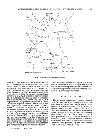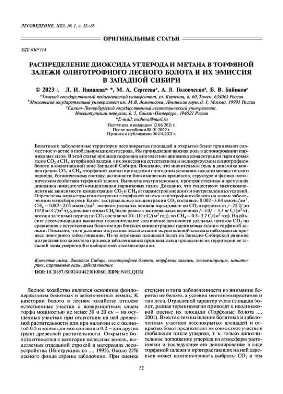Болотные и заболоченные территории лесопокрытых площадей и открытых болот принимают совместное участие в глобальном цикле углерода. Им принадлежит важная роль в депонировании парниковых газов. В этой статье проанализирована многолетняя динамика концентрации парниковых газов СО2 и СН 4 в торфяной залежи и их эмиссия на естественном и мелиорируемом олиготрофном болоте в южнотаежной зоне Западной Сибири. Показано, что значительная роль в динамике концентрации СО2 и СН 4 в торфяной залежи принадлежит погодным условиям каждого месяца теплого периода, ботаническому составу, активности биохимических процессов, структуре и физико-механическим свойствам торфяной залежи. Выявлена внутризалежная, пространственная и временная динамика показателей концентрации парниковых газов. Доказано, что существуют многокомпонентные зависимости концентрации СО2 и СН 4 от параметров внешних и внутризалежных условий. Определены параметры концентрации в торфяной залежи олиготрофного болота на малом заболоченном водосборе реки Ключ: экстремальные концентрации СО2 составили 0.002–3.64 ммоль/дм 3, СН4 – 0.003–2.03 ммоль/дм3; значения удельных потоков варьировали по СО2 в пределах от /–22.2/ до 157.8 мг С/(м2 ч), удельные потоки СН4 были равны в экстремальных величинах /–3.0/ – 5.3 мг С/(м2 ч), потоки за теплый период по СО 2 составили 20–110 г С/(м 2 год), по СН4 – 0.8–3.7 С/(м2 год). На объекте лесомелиорации выявлено незначительное увеличение активности удельных потоков СO 2 по сравнению с естественным болотом при близких концентрациях парниковых газов в торфяной залежи. Показано, что в условиях отсутствия эксплуатации осушительной системы наблюдается процесс повторного заболачивания. Из-за огромных площадей болот на Западно-Сибирской равнине и агрессивного характера процесса заболачивания предполагается проведение на территории ее таежной зоны умеренной и выборочной лесомелиорации