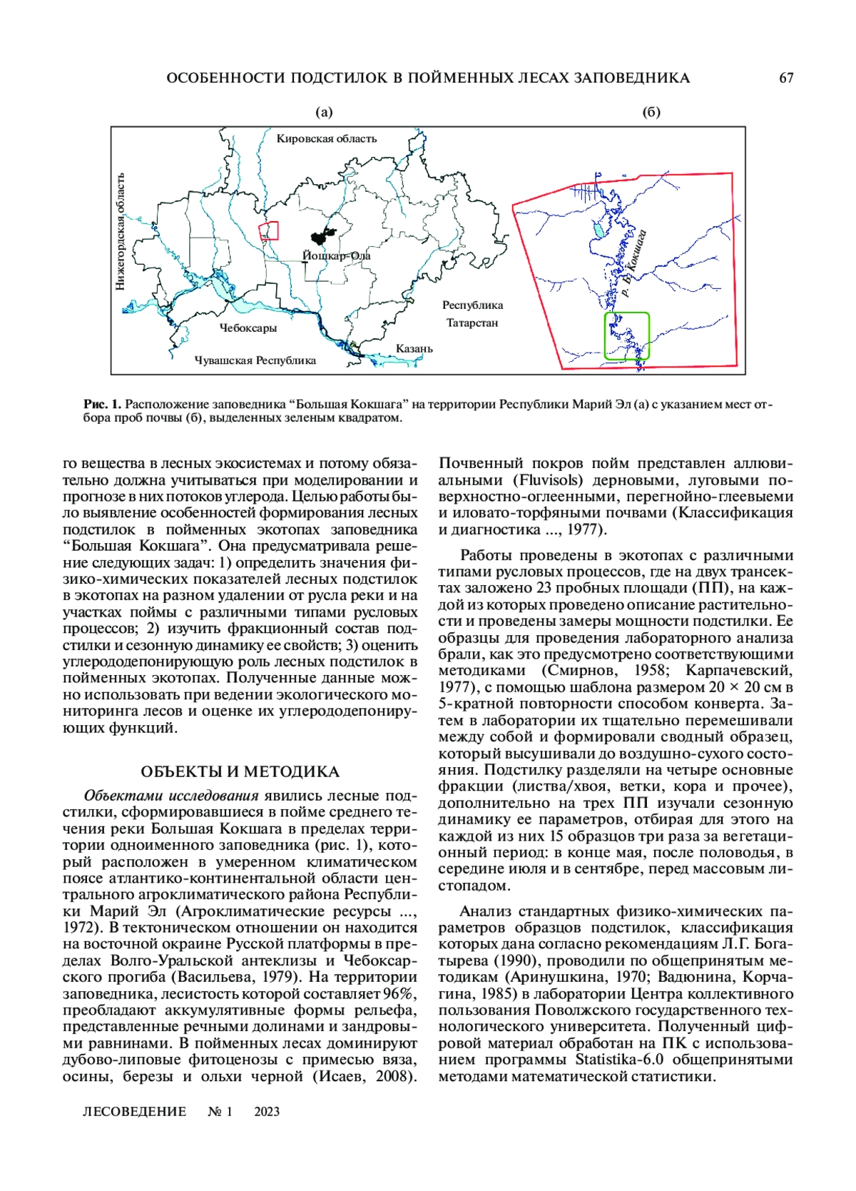 Лесные подстилки, являющиеся продуктом жизнедеятельности и чутким интегральным индикатором состояния биогеоценозов, относятся к их специфической мезострате, выполняющей важные экологические функции, поэтому не случайно почвоведы уделяют очень много внимания их изучению. Несмотря на то, что к настоящему времени накоплен довольно обширный материал по их составу и особенностям формирования в различных биогеоценозах (Мелехов, 1957; Молчанов, 1960; Кошельков, 1961; Шакиров, 1964; Смирнов, 1967; Смольянинов, 1969; Габеев, 1972; Карпачевский, 1973, 1981; Дылис и др., 1975; Сапожников, 1984, 1987; Дылис, 1985; Попова, Горбачев, 1988; Богатырёв, Щенина, 1989; Богатырёв, 1990, 1996; Сабиров, 1996; Ушакова, 1999; 2000; Аткина, Аткин, 2000; Рыжкова, 2003; Богатырёв и др., 2004, 2019; Пуряев, Газизуллин, 2011; Демаков и др., 2013, 2015, 2017), многие вопросы остаются пока слабо освещенными и дискуссионными. Особенно недостаточно изучены подстилки в пойменных лесах, почвенный покров которых характеризуется значительной вариабельностью (Виленский, 1955; Добровольский, 1968; Фаткуллин, 1968; Максимов, 1974; Миркин, 1974; Шаталов и др., 1984; Браславская, 2004; Исаев, 2008), обусловленной комплексным воздействием большого числа биогеоценотических и гидрологических факторов.