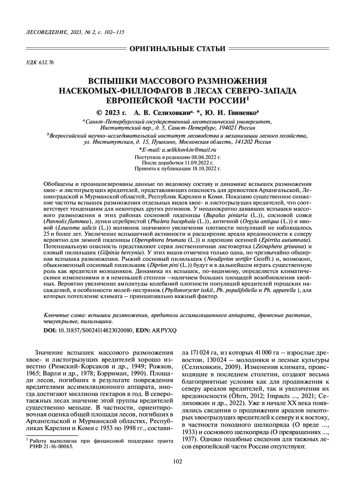 52. Селиховкин А.В., Мандельштам М.Ю., Поповичев Б.Г., Алексеев А.С. Роль вредителей в изменении состояния лесов на северо-западе европейской части России // Лесоведение. 2022в. № 5 (в печати).