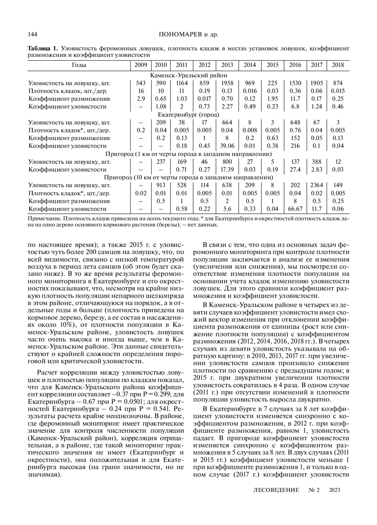 Метод феромонного мониторинга в системе надзора за плотностью вредителей приобрел широкую популярность ввиду его относительной простоты. Целью исследования был анализ степени соответствия результатов феромонного мониторинга и динамики плотности популяции непарного шелкопряда (Lymantria dispar (L.)), а также внешних факторов, влияющих на результаты феромонного мониторинга. Феромонный мониторинг проводили на ареале зауральской популяции в Свердловской области, в двух районах – с высокой плотностью популяции и периодическими вспышками массового размножения и очень низкой плотностью, с отсутствием периодических вспышек массового размножения в течение 10 лет. Параллельно с феромонным мониторингом проводили мониторинг плотности популяции на основании осеннего учета кладок. Результаты многолетнего феромонного мониторинга непарного шелкопряда позволяют прийти к следующим выводам. Основное влияние на уловистость ловушек оказывают погодные условия, в том числе температура воздуха и устойчивость воздушных потоков в период лета самцов. Плотность кладок и коэффициент размножения популяции непарного шелкопряда могут оказывать влияние на результаты феромонного мониторинга, но они не являются определяющими. Делать прогнозы изменения плотности популяции этого вида можно только при детальном феромонном мониторинге с точным фиксированием периода основного лета самцов и на основании поправочных коэффициентов, учитывающих погодные условия. Экономическая целесообразность такого рода работ с целью оценки плотности вредителя и слежения за динамикой численности представляется авторам сомнительной