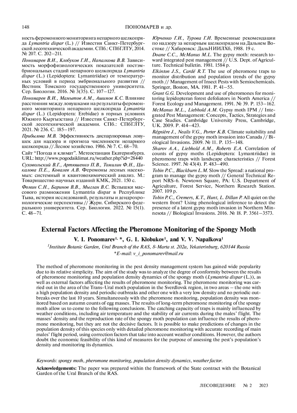 5. Пономарев В.И. Клобуков Г.И., Орозумбеков А.А., Серый Г.А. Влияние погодных факторов на результативность феромонного мониторинга непарного шелкопряда Lymantria dispar (L.) // Известия Санкт-Петербургской лесотехнической академии. СПб.: СПбГЛТУ, 2014. № 207. С. 202-211. EDN: RHBIGR