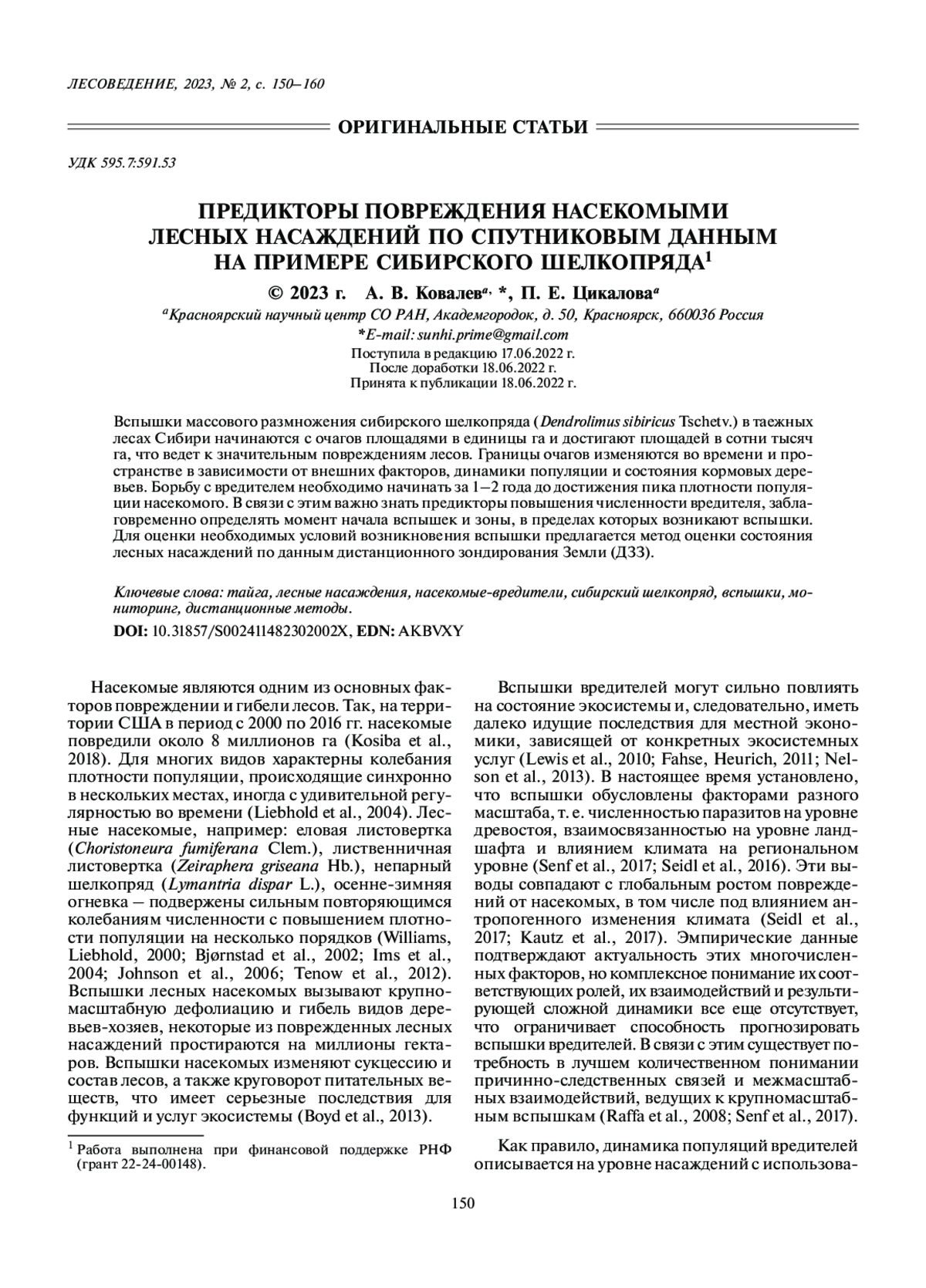 22. Kovalev A., Soukhovolsky V. Analysis of Forest Stand Resistance to Insect Attack According to Remote Sensing Data // Forests. 2021. V. 12. P. 1188. DOI: 10.3390/f12091188 EDN: UZETDU