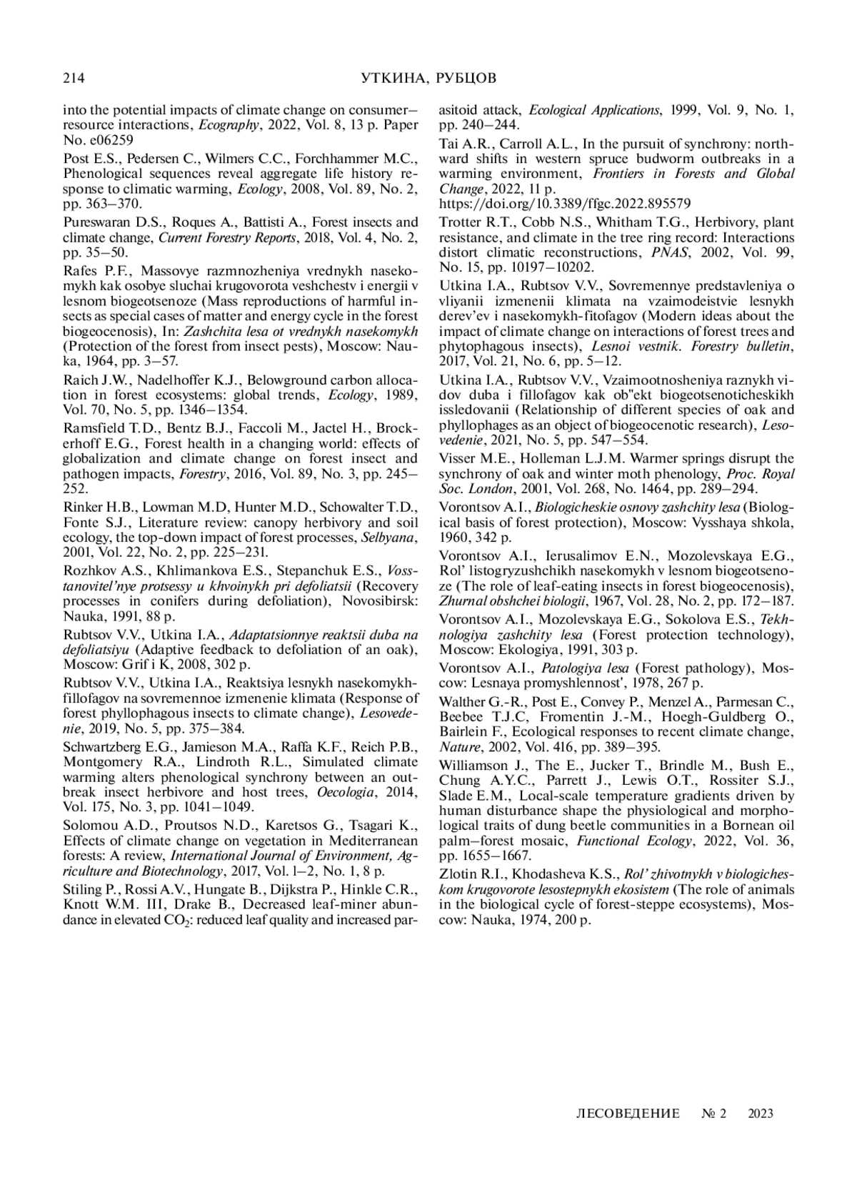 28. Рубцов В.В., Уткина И.А. Реакция насекомых-филлофагов на современные изменения климата // Лесоведение. 2019. № 5. С. 375–384. EDN: OGDWNK