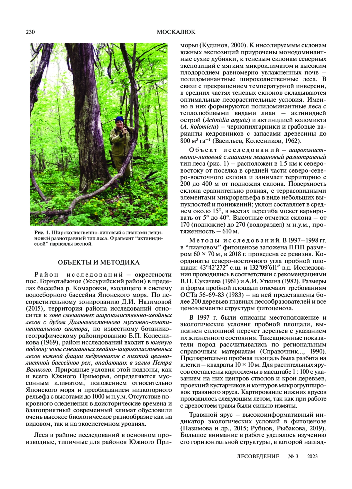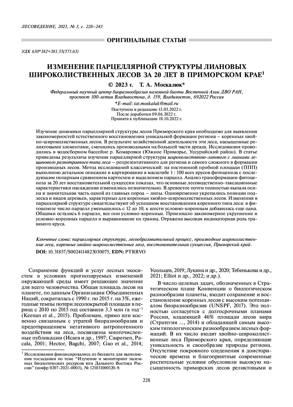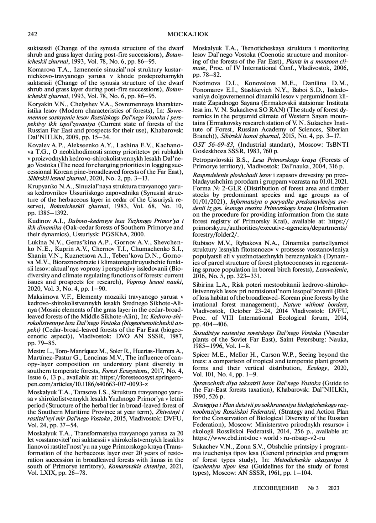 18. Москалюк Т.А. Трансформация травяного яруса за 20 лет восстановительной сукцессии в широколиственных лесах с лиановой растительностью на юге Приморского края // Комаровские чтения, 2021. Вып. LXIX. С. 26–78.