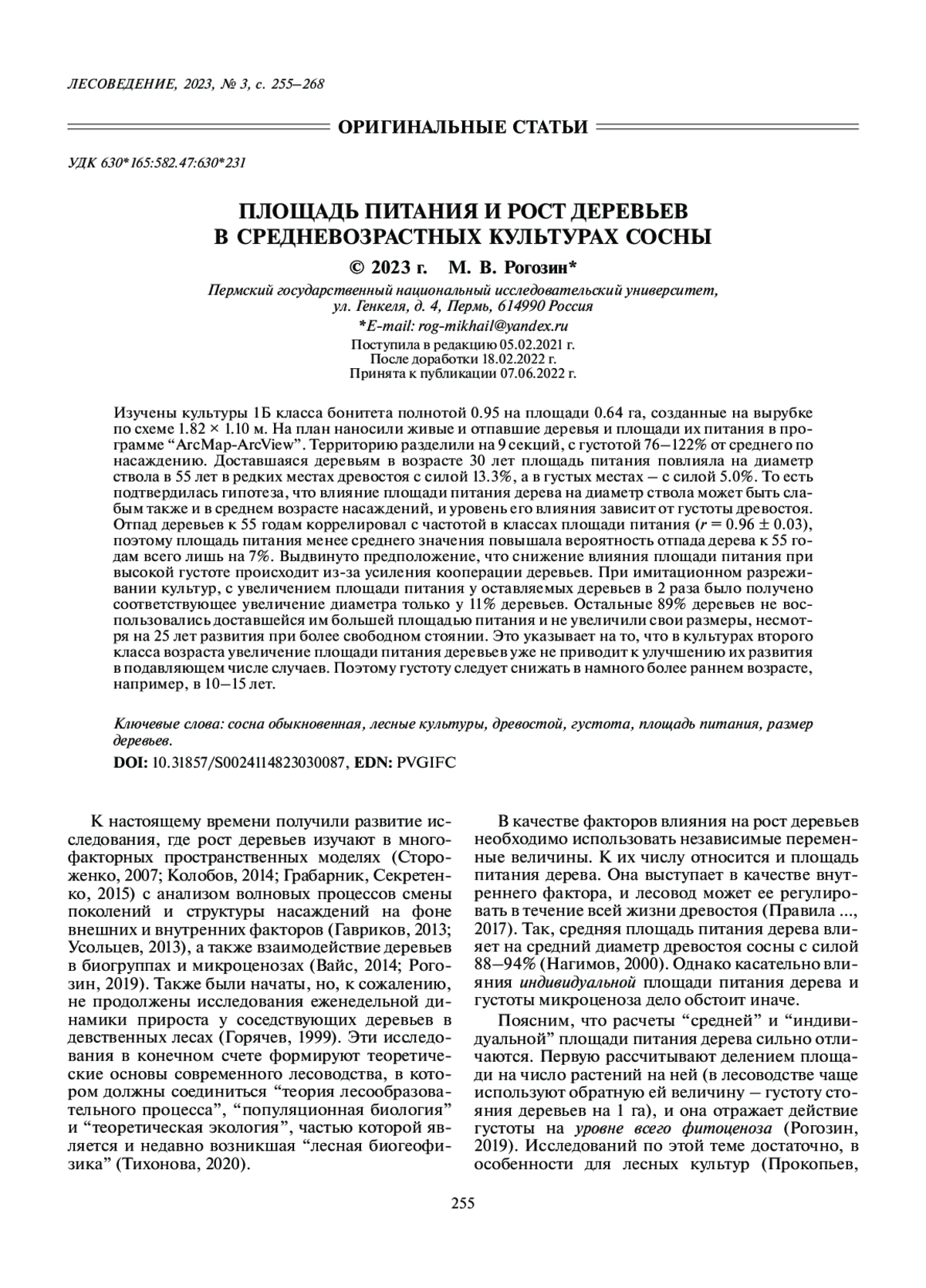 16. Мартынов А.Н. Зависимость биометрических показателей сосны от площади питания // Лесоведение. 1976. № 5. С. 85–88.