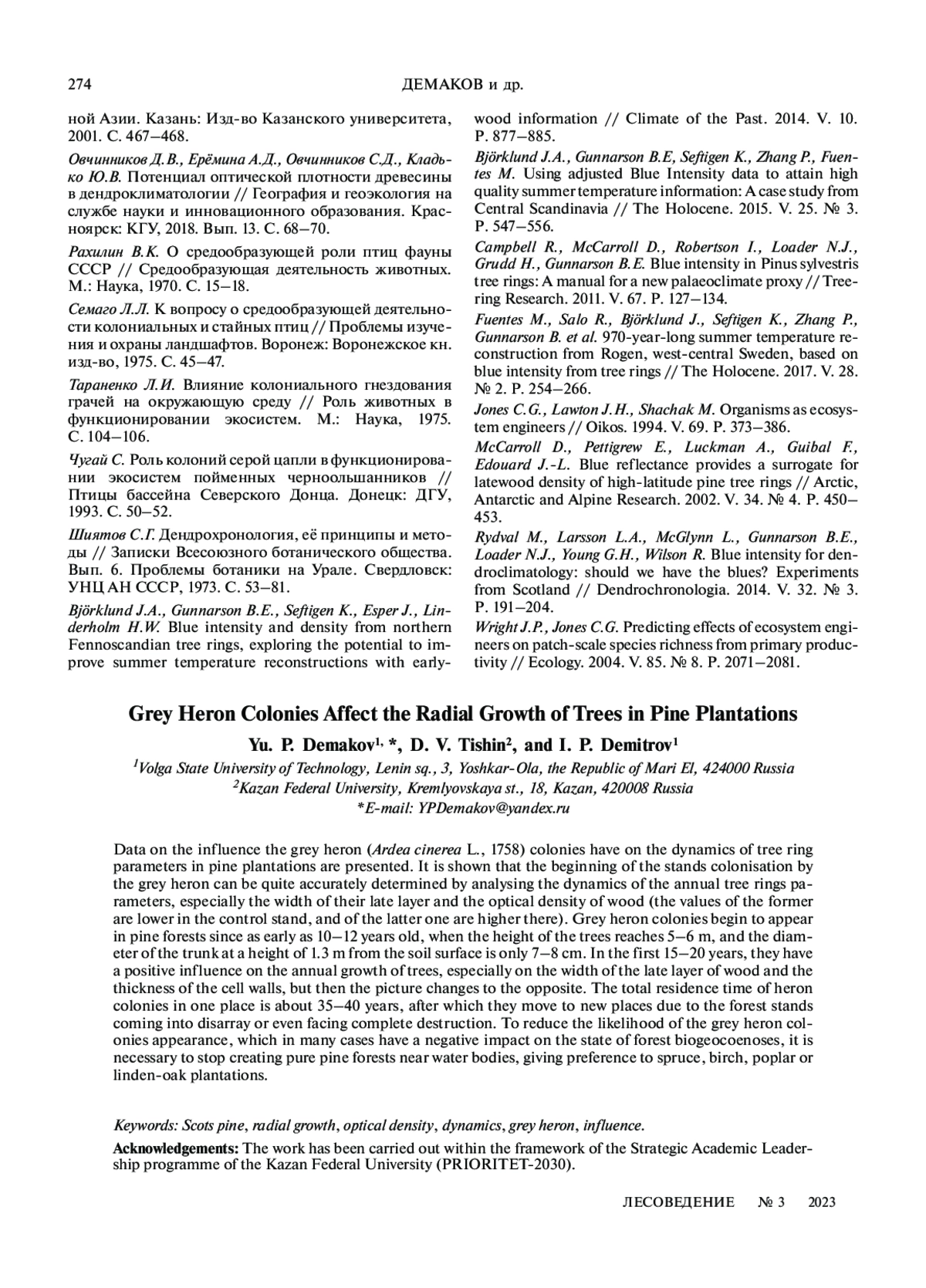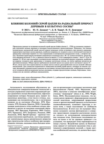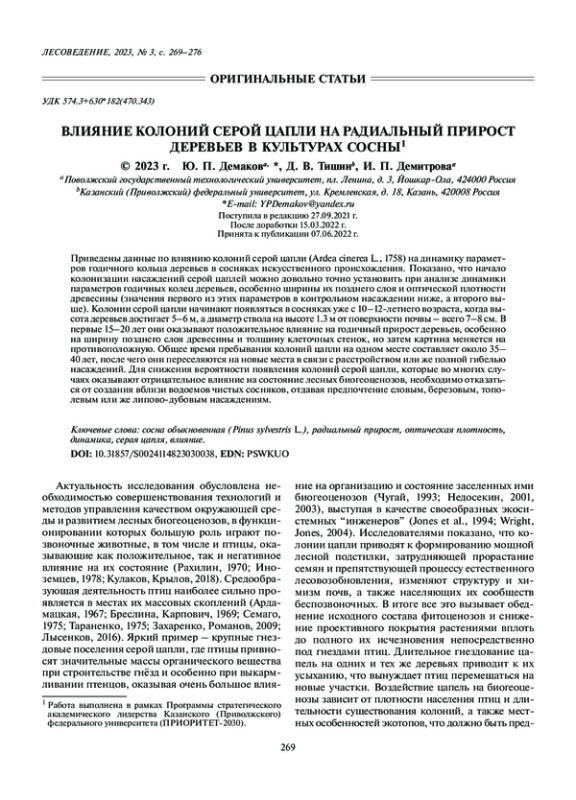 Приведены данные по влиянию колоний серой цапли (Ardea cinerea L., 1758) на динамику параметров годичного кольца деревьев в сосняках искусственного происхождения. Показано, что начало колонизации насаждений серой цаплей можно довольно точно установить при анализе динамики параметров годичных колец деревьев, особенно ширины их позднего слоя и оптической плотности древесины (значения первого из этих параметров в контрольном насаждении ниже, а второго выше). Колонии серой цапли начинают появляться в сосняках уже с 10–12-летнего возраста, когда высота деревьев достигает 5–6 м, а диаметр ствола на высоте 1.3 м от поверхности почвы – всего 7–8 см. В первые 15–20 лет они оказывают положительное влияние на годичный прирост деревьев, особенно на ширину позднего слоя древесины и толщину клеточных стенок, но затем картина меняется на противоположную. Общее время пребывания колоний цапли на одном месте составляет около 35– 40 лет, после чего они переселяются на новые места в связи с расстройством или же полной гибелью насаждений. Для снижения вероятности появления колоний серой цапли, которые во многих случаях оказывают отрицательное влияние на состояние лесных биогеоценозов, необходимо отказаться от создания вблизи водоемов чистых сосняков, отдавая предпочтение еловым, березовым, тополевым или же липово-дубовым насаждениям