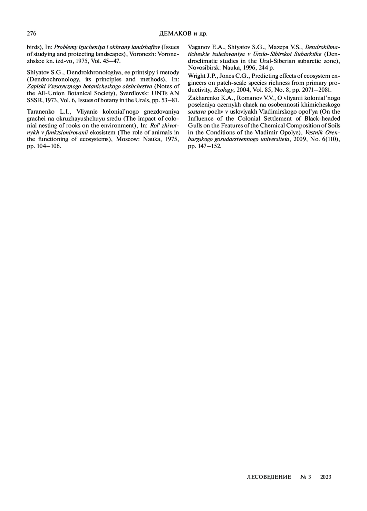 4. Ваганов Е.А., Шиятов С.Г., Мазепа В.С. Дендроклиматические исследования в Урало-Сибирской Субарктике. Новосибирск: Наука, 1996. 246 с. EDN: QYXFGP
